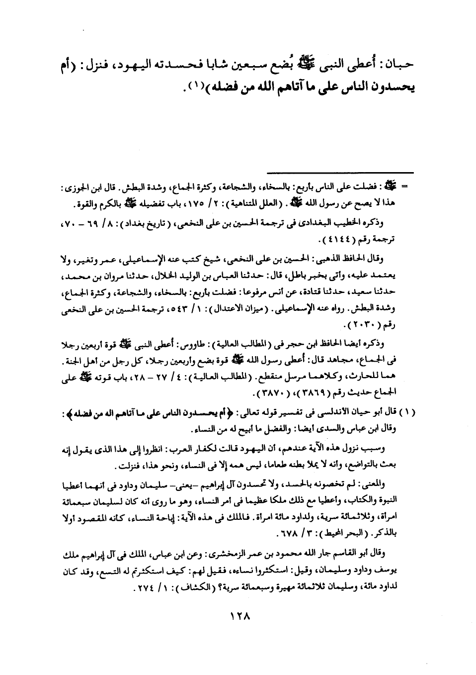 [ (1) ] قال أبو حيان الأندلسى في تفسير قوله تعالى: أَمْ يَحْسُدُونَ النَّاسَ عَلى ما آتاهُمُ اللَّهُ مِنْ فَضْلِهِ: