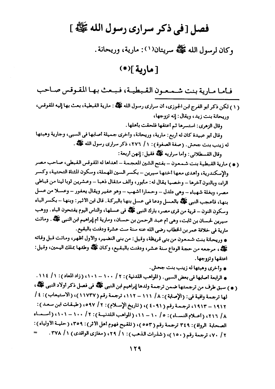 [ (1) ] لكن ذكر أبو الفرج ابن الجوزي، أن سراري رسول اللَّه صلّى اللَّه عليه وسلم: مارية القبطية، بعث بها إليه المقوقس، وريحانة بنت زيد، ويقال: إنه تزوجها، وقال الزهري: استسرها ثم أعتقها فلحقت بأهلها.