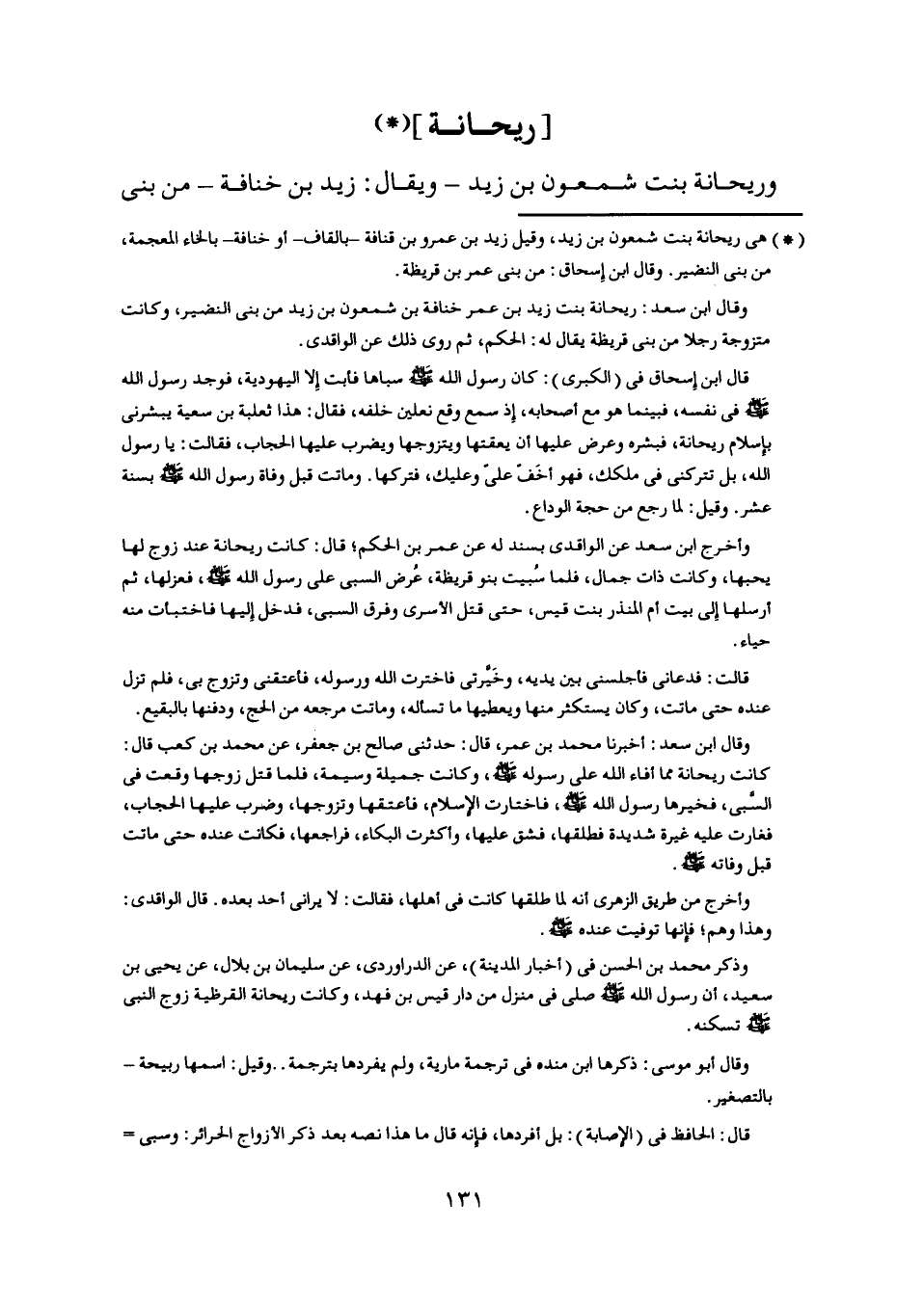 [ (1) ] هي ريحانة بنت شمعون بن زيد، وقيل زيد بن عمرو بن قنافة- بالقاف- أو خنافة- بالخاء المعجمة، من بنى النضير. وقال ابن إسحاق: من بنى عمر بن قريظة.