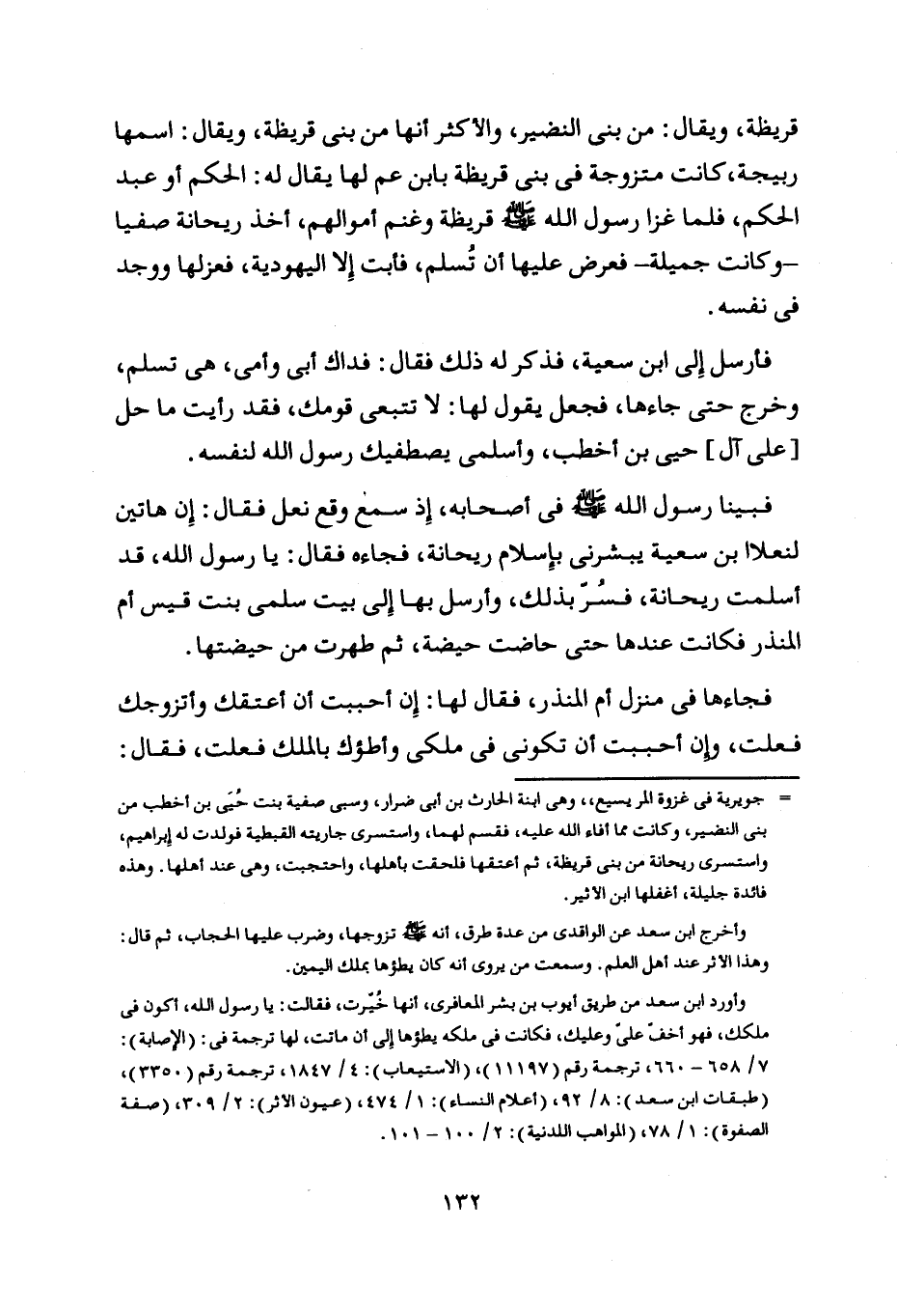 فبينا رسول اللَّه صلّى اللَّه عليه وسلم في أصحابه، إذ سمع وقع نعل فقال: إن هاتين لنعلا ابن سعية يبشرني بإسلام ريحانة، فجاءه فقال: يا رسول اللَّه، قد أسلمت ريحانة، فسرّ بذلك، وأرسل بها إلى بيت سلمى بنت قيس أم المنذر فكانت عندها حتى حاضت حيضة، ثم طهرت من حيضتها.