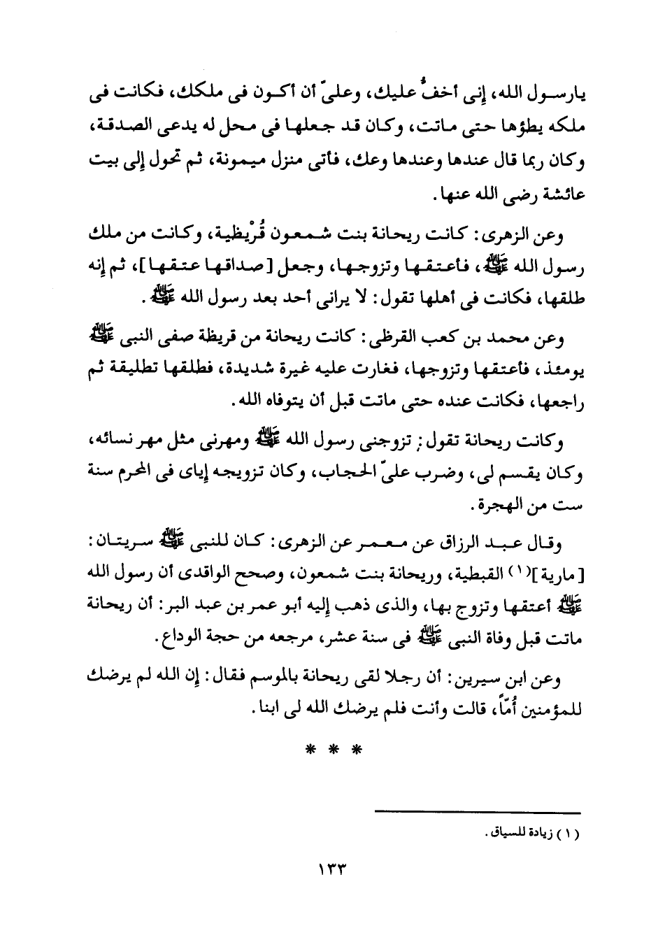 [مارية] [ (1) ] القبطية، وريحانة بنت شمعون، وصحح الواقدي أن رسول اللَّه صلّى اللَّه عليه وسلم أعتقها وتزوج بها، والّذي ذهب إليه أبو عمر بن عبد البر: أن ريحانة ماتت قبل وفاة النبي صلّى اللَّه عليه وسلم في سنة عشر، مرجعه من حجة الوداع.