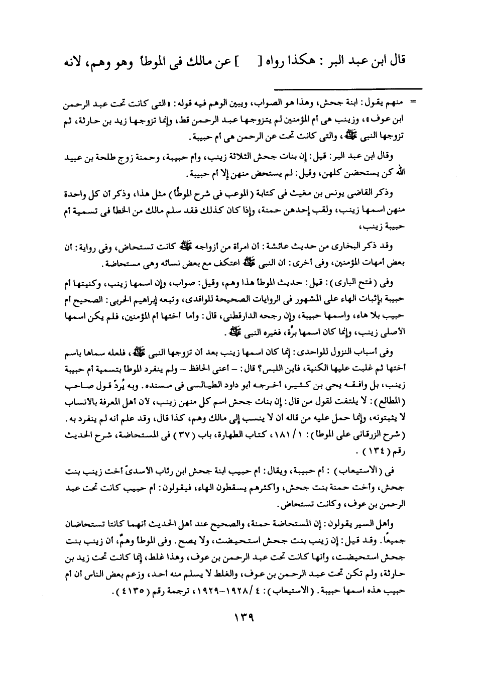 وأهل السير يقولون: إن المستحاضة حمنة، والصحيح عند أهل الحديث أنهما كانتا تستحاضان جميعا. وقد قيل: إن زينب بنت جحش استحيضت، ولا يصح. وفي الموطأ وهم، أن زينب بنت جحش استحيضت، وأنها كانت تحت عبد الرحمن بن عوف، وهذا غلط، إنما كانت تحت زيد بن حارثة، ولم تكن تحت عبد الرحمن بن عوف، والغلط لا يسلم منه أحد، وزعم بعض الناس أن أم حبيب هذه اسمها حبيبة. (الاستيعاب) : 4/ 1928- 1929، ترجمة رقم (4135) .