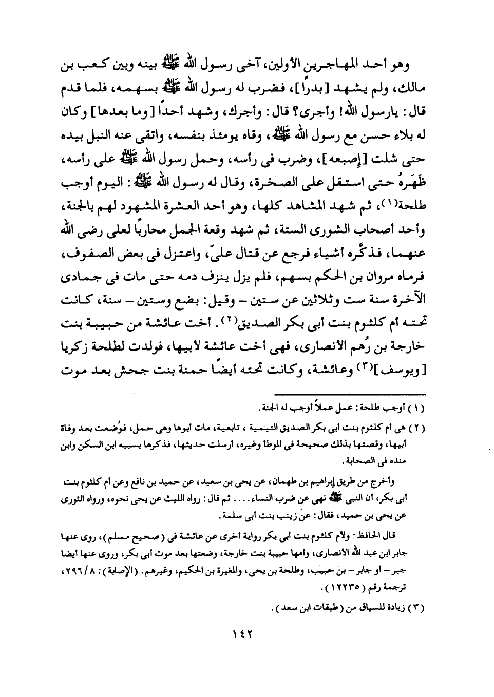 وهو أحد العشرة المشهود لهم بالجنة، وأحد أصحاب الشورى الستة، ثم شهد وقعة الجمل محاربا لعلى رضى اللَّه عنهما، فذكّره أشياء فرجع عن قتال عليّ، واعتزل في بعض الصفوف، فرماه مروان بن الحكم بسهم، فلم يزل ينزف دمه حتى مات في جمادى الآخرة سنة ست وثلاثين عن ستين- وقيل: بضع وستين- سنة، كانت تحته أم كلثوم بنت أبى بكر الصديق [ (2) ] . أخت عائشة من حبيبة بنت خارجة بن رهم الأنصاري، فهي أخت عائشة لأبيها، فولدت لطلحة زكريا [ويوسف] [ (3) ] وعائشة، وكانت تحته أيضا حمنة بنت جحش بعد موت