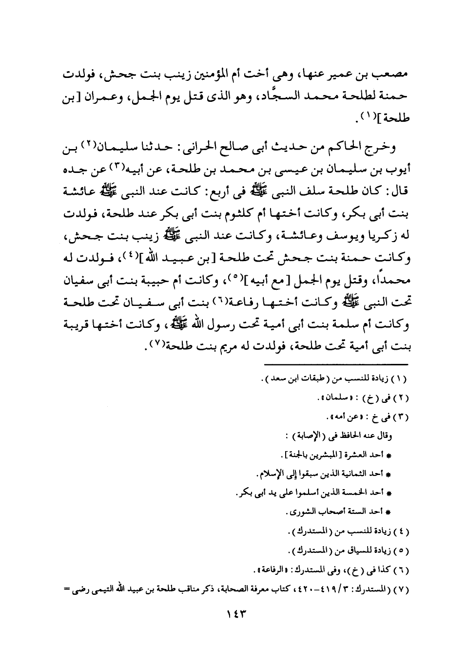 وخرج الحاكم من حديث أبى صالح الحراني: حدثنا سليمان [ (2) ] بن أيوب بن سليمان بن عيسى بن محمد بن طلحة، عن أبيه [ (3) ] عن جده قال: كان طلحة سلف النبي صلّى اللَّه عليه وسلم في أربع: كانت عند النبي صلّى اللَّه عليه وسلم عائشة بنت أبى بكر، وكانت أختها أم كلثوم بنت أبى بكر عند طلحة، فولدت له زكريا ويوسف وعائشة، وكانت عند النبي صلّى اللَّه عليه وسلم زينب بنت جحش، وكانت حمنة بنت جحش تحت طلحة [بن عبيد اللَّه] [ (4) ] ، فولدت له محمدا، وقتل يوم الجمل [مع أبيه] [ (5) ] ، وكانت أم حبيبة بنت أبى سفيان تحت النبي صلّى اللَّه عليه وسلم وكانت أختها رفاعة [ (6) ] بنت أبى سفيان تحت طلحة وكانت أم سلمة بنت أبى أمية تحت رسول اللَّه صلّى اللَّه عليه وسلم، وكانت أختها قريبة بنت أبى أمية تحت طلحة، فولدت له مريم بنت طلحة [ (7) ] .