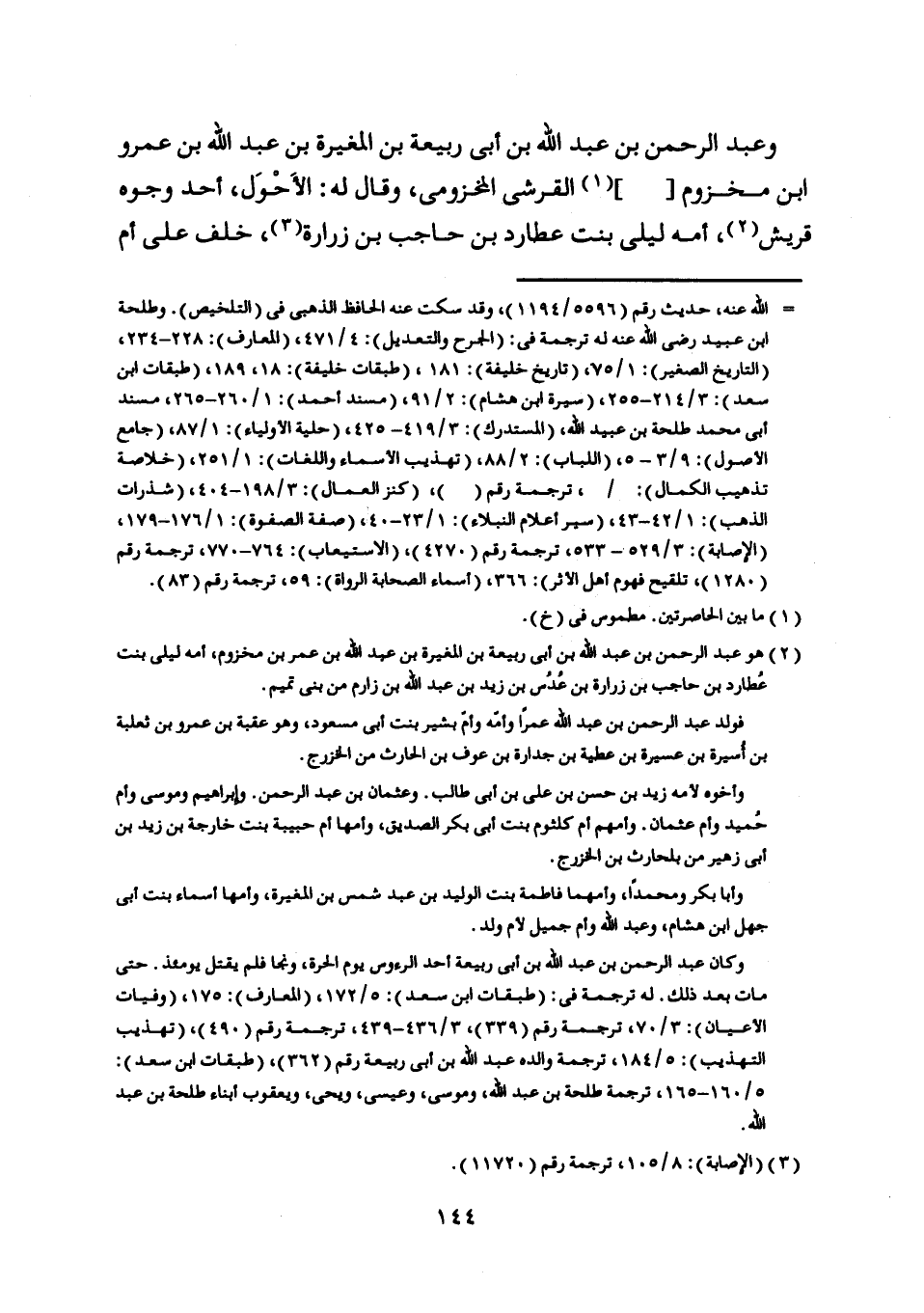 وعبد الرحمن بن عبد اللَّه بن أبى ربيعة بن المغيرة بن عبد اللَّه بن عمرو ابن مخزوم [] [ (1) ] القرشي المخزومي، وقال له: الأحول، أحد وجوه قريش [ (2) ] ، أمه ليلى بنت عطارد بن حاجب بن زرارة [ (3) ] ، خلف على أم