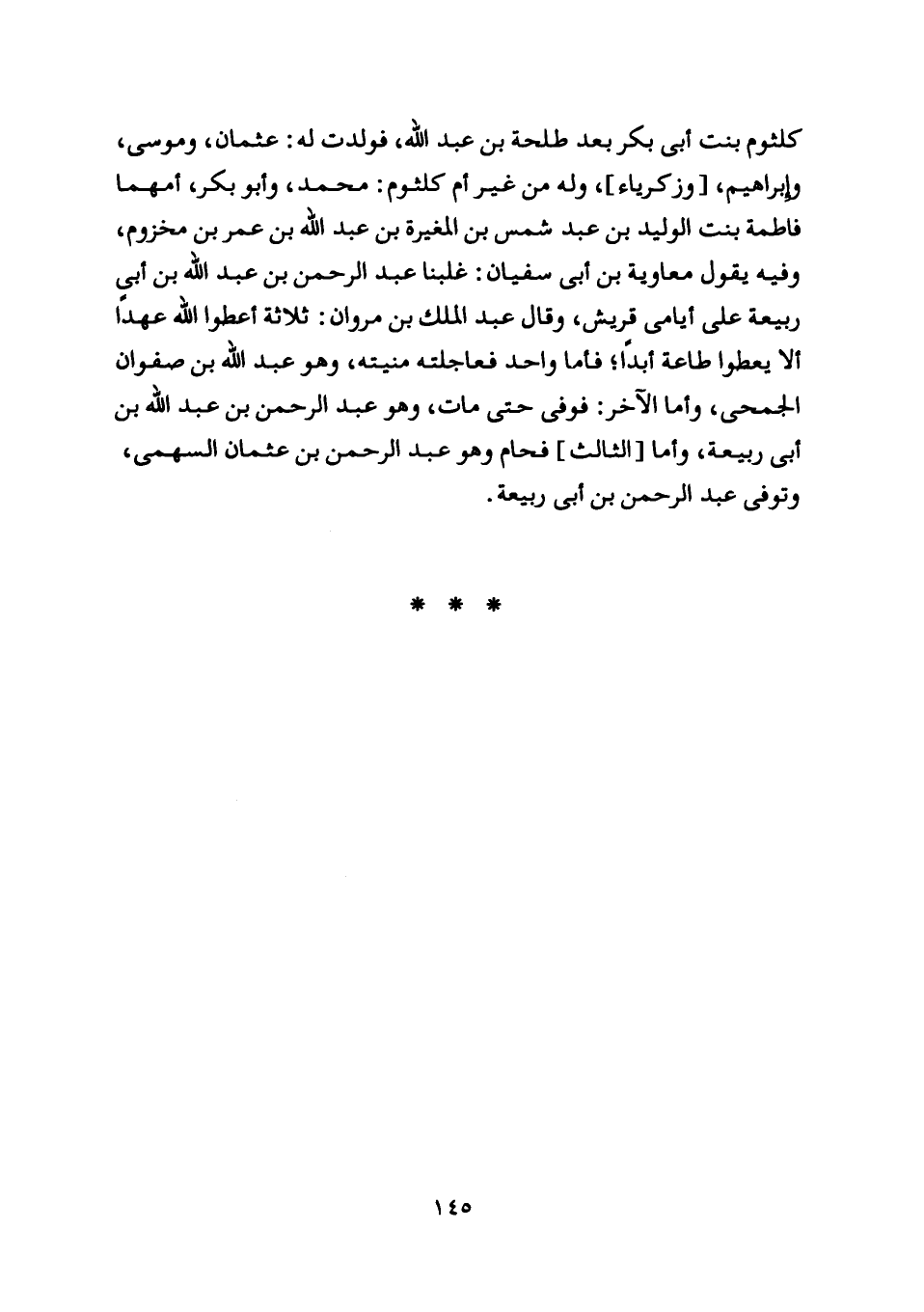كلثوم بنت أبى بكر بعد طلحة بن عبد اللَّه، فولدت له: عثمان، وموسى، وإبراهيم، [وزكريا] ، وله من غير أم كلثوم: محمد، وأبو بكر، أمهما فاطمة بنت الوليد بن عبد شمس بن المغيرة بن عبد اللَّه بن عمر بن مخزوم، وفيه يقول معاوية بن أبى سفيان: غلبنا عبد الرحمن بن عبد اللَّه بن أبى ربيعة على أيام قريش، وقال عبد الملك بن مروان: ثلاثة أعطوا اللَّه عهدا ألا يعطوا طاعة أبدا، فأما واحد فعاجلته منيته، وهو عبد اللَّه بن صفوان الجمحيّ، وأما الآخر: فوفى حتى مات، وهو عبد الرحمن بن عبد اللَّه بن أبى ربيعة، وأما [الثالث] فحام وهو عبد الرحمن بن عثمان السهمي، وتوفى عبد الرحمن بن أبى ربيعة.