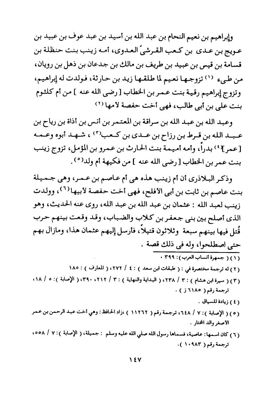 وإبراهيم بن نعيم النحام بن عبد اللَّه بن أسيد بن عبد عوف بن عبيد بن عويج بن عدي بن كعب القرشيّ العدوي، أمه زينب بنت حنظلة بن قسامة بن قيس بن عبيد بن طريف بن مالك بن جدعان بن ذهل بن رويان، من طيِّئ [ (1) ] تزوجها نعيم لما طلقها زيد بن حارثة، فولدت له إبراهيم، وتزوج إبراهيم رقية بنت عمر بن الخطاب [رضى اللَّه عنه] من أم كلثوم بنت على بن أبى طالب، فهي أخت حفصة لأمها [ (2) ] وعبد اللَّه بن عبد اللَّه بن سراقة بن المعتمر بن أنس بن أذاة بن رياح بن عبد اللَّه بن قرط بن رزاح بن عدي بن كعب [ (3) ] ، شهد أبوه وعمه [عمر] [ (4) ] بدرا، وأمه أميمة بنت الحارث بن عمرو بن المؤمل، تزوج زينب بنت عمر بن الخطاب [رضى اللَّه عنه] من فكيهة أم ولد [ (5) ] .
