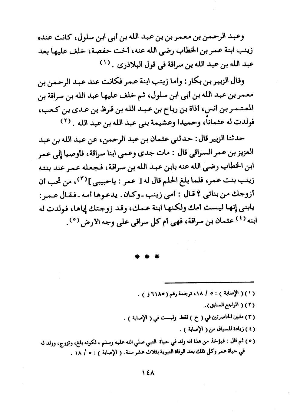 وقال الزبير بن بكار: وأما زينب ابنة عمر فكانت عند عبد الرحمن بن معمر بن عبد اللَّه بن أبى ابن سلول، ثم خلف عليها عبد اللَّه بن سراقة بن المعتمر بن أنس، أذاة بن رباح بن عبد اللَّه بن قرظ بن عدي بن كعب، فولدت له عثمانا، وحميدا وعشيمة بنى عبد اللَّه بن عبد اللَّه. [ (2) ]