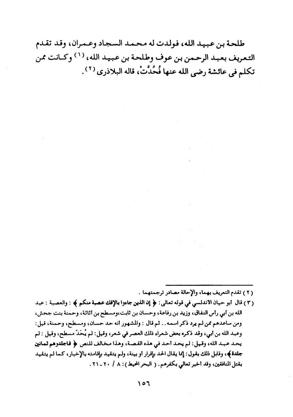 [ (2) ] قال أبو حيان الأندلسي في قوله تعالى: إِنَّ الَّذِينَ جاؤُ بِالْإِفْكِ عُصْبَةٌ مِنْكُمْ: والعصبة: عبد اللَّه بن أبي رأس النفاق، وزيد بن رفاعة، وحسان بن ثابت، ومسطح بن أثاثة، وحمنة بنت جحش، ومن ساعدهم ممن لم يرد ذكر اسمه.. ثم قال: والمشهور أنه حد حسان، ومسطح، وحمنة، قيل: