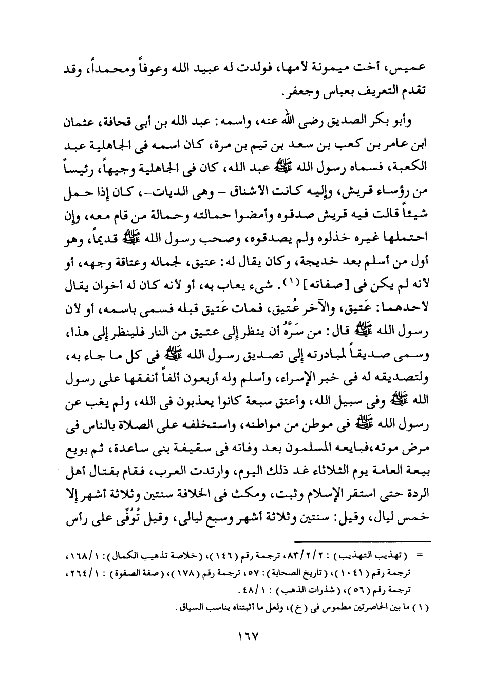 وسمى صديقا لمبادرته إلى تصديق رسول اللَّه صلّى اللَّه عليه وسلم في كل ما جاء به، ولتصديقه له في خبر الإسراء، وأسلم وله أربعون ألفا أنفقها على رسول اللَّه صلّى اللَّه عليه وسلم وفي سبيل اللَّه، وأعتق سبعة كانوا يعذبون في اللَّه، ولم يغب عن رسول اللَّه صلّى اللَّه عليه وسلم في موطن من مواطنه، واستخلفه على الصلاة بالناس في مرض موته، فبايعه المسلمون بعد وفاته في سقيفة بنى ساعدة، ثم بويع بيعة العامة يوم الثلاثاء غد ذلك اليوم، وارتدت العرب، فقام بقتال أهل الردة حتى استقر الإسلام وثبت، ومكث في الخلافة سنتين وثلاثة أشهر إلا خمس ليال، وقيل: سنتين وثلاثة أشهر وسيع ليالي، وقيل توفّى على رأس
