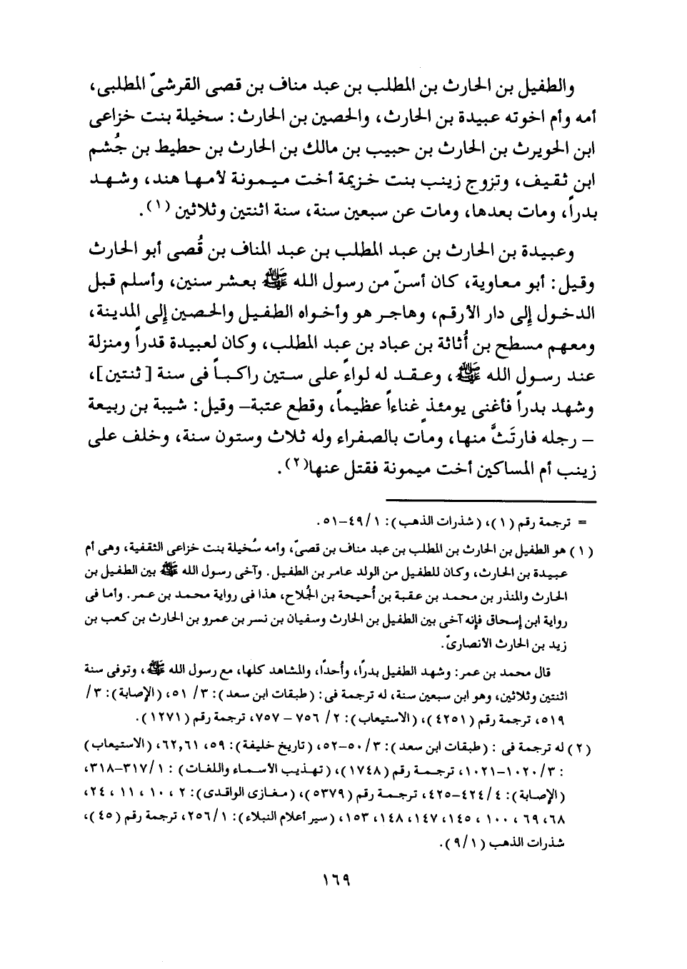 وعبيدة بن الحارث بن عبد المطلب بن عبد المناف بن قصي أبو الحارث وقيل: أبو معاوية، كان أسنّ من رسول اللَّه صلّى اللَّه عليه وسلم بعشر سنين، وأسلم قبل الدخول إلى دار الأرقم، وهاجر هو وأخواه الطفيل والحصين إلى المدينة، ومعهم مسطح بن أثاثة بن عباد بن عبد المطلب، وكان لعبيدة قدرا ومنزلة عند رسول اللَّه صلّى اللَّه عليه وسلم، وعقد له لواء على ستين راكبا في سنة [ثنتين] ، وشهد بدرا فأغنى يومئذ غناء عظيما، وقطع عتبة- وقيل: شيبة بن ربيعة- رجله فارتثّ منها، ومات بالصفراء وله ثلاث وستون سنة، وخلف على زينب أم المساكين أخت ميمونة فقتل عنها [ (2) ] .