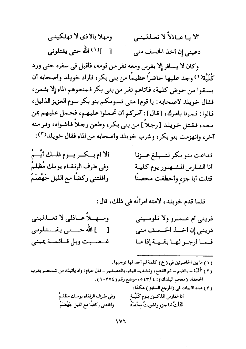 وكان لا يسافر إلا بفرس ومعه نفر من قومه، فأقبل في سفره حتى ورد كليّة [ (2) ] وجد عليها حاضرا عظيما من بنى بكر، فأراد خويلد وأصحابه أن يسقوا من حوض كلية، فأتاهم نفر من بنى بكر فمنعوهم الماء إلا بثمن، فقال خويلد لأصحابه: يا قوم! متى تسومكم بنو بكر سوم العزيز الذليل، قالوا: فمرنا بأمرك، [قال] : آمركم أن تحملوا عليهم، فحمل عليهم بمن معه، فقتل خويلد [رجلا] من بنى بكر، وطعن رجلا فأشواه، وفر منه آخر، وانهزمت بنو بكر، وشرب خويلد وأصحابه من الماء فقال خويلد [ (3) ] :