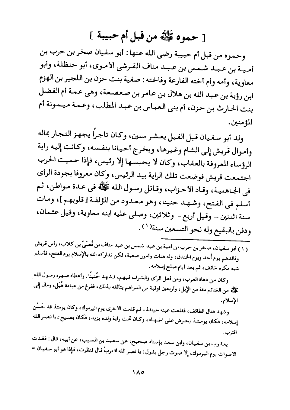 ولد أبو سفيان قبل الفيل بعشر سنين، وكان تاجرا يجهز التجار بماله وأموال قريش إلى الشام وغيرها، ويخرج أحيانا بنفسه، وكانت إليه راية الرؤساء المعروفة بالعقاب، وكان لا يحبسها إلا رئيس، فإذا حميت الحرب اجتمعت قريش فوضعت تلك الراية بيد الرئيس، وكان معروفا بجودة الرأى في الجاهلية، وقاد الأحزاب، وقاتل رسول اللَّه صلّى اللَّه عليه وسلم في عدة مواطن، ثم أسلم في الفتح، وشهد حنينا، وهو معدود من المؤلفة [قلوبهم] ، ومات سنة اثنتين- وقيل أربع- وثلاثين، وصلّى عليه ابنه معاوية، وقيل عثمان، ودفن بالبقيع وله نحو التسعين سنة [ (1) ] .