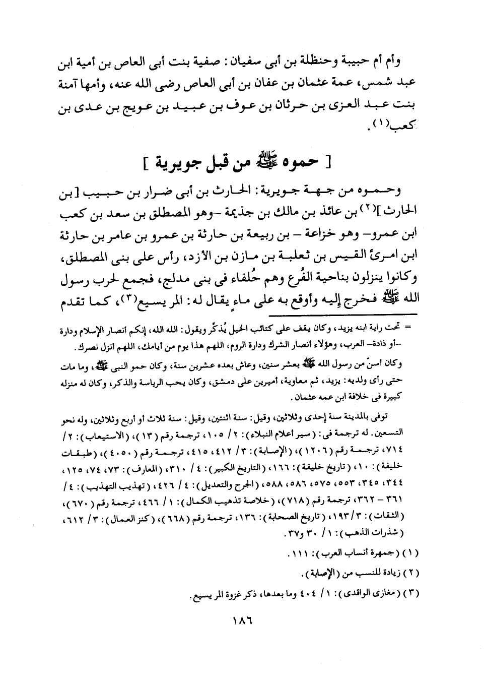 وحموه من جهة جويرية: الحارث بن أبى ضرار بن حبيب [بن الحارث] [ (2) ] بن عائذ بن مالك بن جذيمة- وهو المصطلق بن سعد بن كعب ابن عمرو- وهو خزاعة- بن ربيعة بن حارثة بن عمرو بن عامر بن حارثة ابن امرئ القيس بن ثعلبة بن مازن بن الأزد، رأس على بنى المصطلق، وكانوا ينزلون بناحية الفرع وهم حلفاء في بنى مدلج، فجمع لحرب رسول اللَّه صلّى اللَّه عليه وسلم فخرج إليه وأوقع به على ماء يقال له: المريسيع [ (3) ] ، كما تقدم