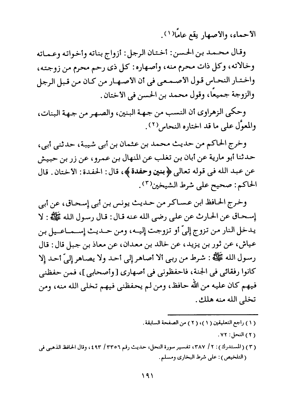 وخرج الحاكم من حديث محمد بن عثمان بن أبى شيبة، حدثني أبى، حدثنا أبو مارية عن أبان بن تغلب عن المنهال بن عمرو، عن زر بن حبيش عن عبد اللَّه في قوله تعالى بَنِينَ وَحَفَدَةً، قال: الحفدة: الأختان. قال الحاكم: صحيح على شرط الشيخين [ (3) ] .