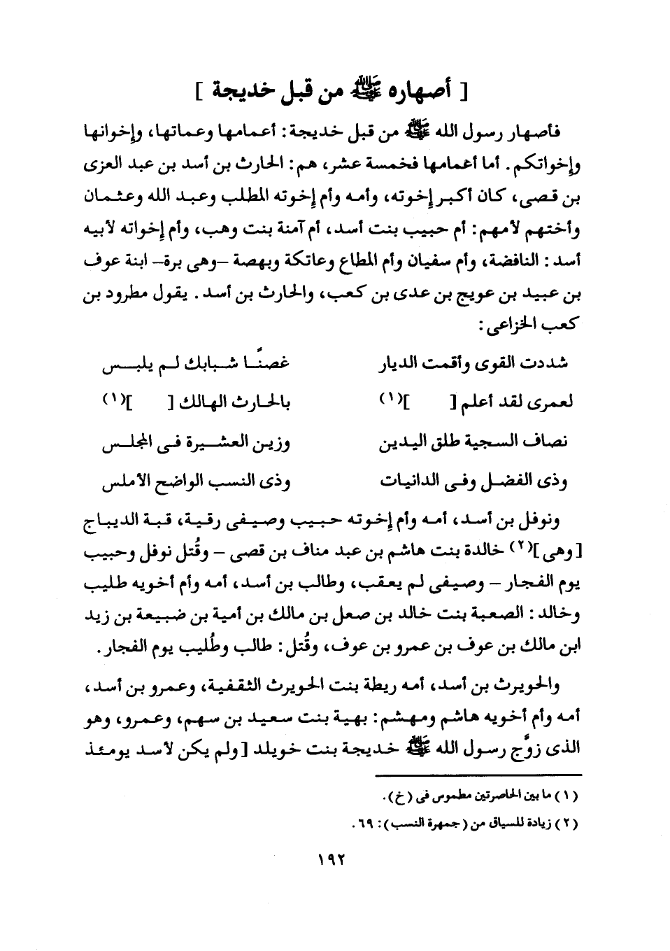 فأصهار رسول اللَّه صلّى اللَّه عليه وسلم من قبل خديجة: أعمامها وعماتها، وإخوانها وأخواتها. أما أعمامها فخمسة عشر، هم: الحارث بن أسد بن عبد العزى بن قصي، كان أكبر إخوته، وأمه وأم إخوته المطلب وعبد اللَّه وعثمان وأختهم لأمهم: أم حبيب بنت أسد، أم آمنة بنت وهب، وأم أخواته لأبيه أسد: النافضة، وأم سفيان وأم المطاع وعاتكة وبهصة- وهي برة- ابنة عوف بن عبيد بن عويج بن عدي بن كعب، والحارث بن أسد. يقول مطرود بن كعب الخزاعي: