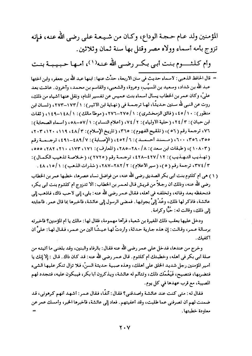 [ (1) ] هي أم كلثوم بنت أبى بكر الصديق رضى اللَّه عنه، من فواضل نساء عصرها، خطبها عمر بن الخطاب رضى اللَّه عنه، وذلك أن رجلا من قريش قال لعمر بن الخطاب: ألا تتزوج أم كلثوم بنت أبى بكر، فتحفظه بعد وفاته، وتخلفه في أهله، فقال عمر رضى اللَّه عنه: بلى، إني لأحب ذاك، فاذهب إلى عائشة، فاذكر لها ذلك، وعد إليّ بجوابها. فمضى الرسول إلى عائشة، فأخبرها بما قال عمر. فأجابته إلى ذلك، وقالت له: حبّا وكرامة.