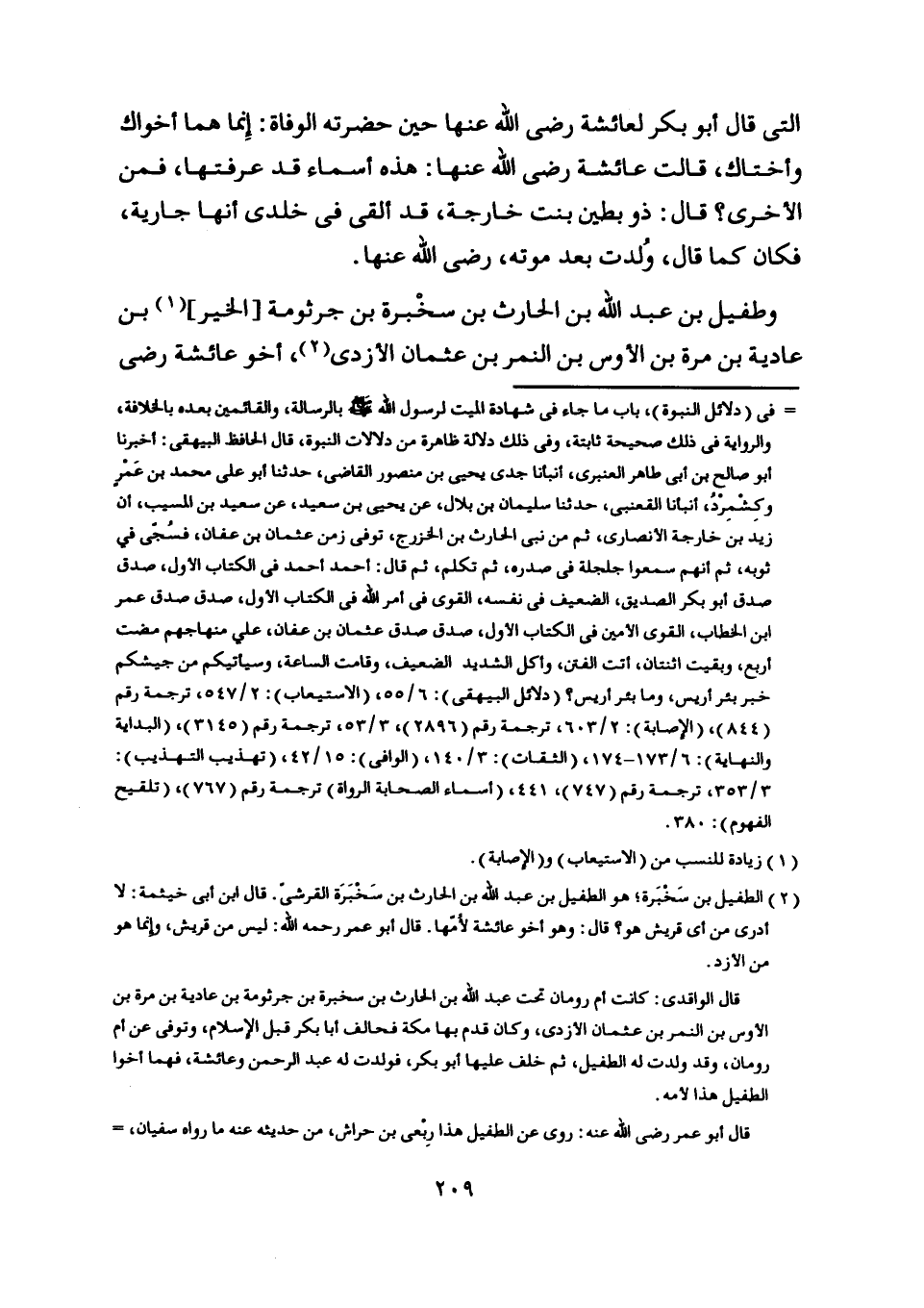 [ (2) ] الطفيل بن سخبرة، هو الطفيل بن عبد اللَّه بن الحارث بن سخبرة القرشيّ. قال ابن أبى خيثمة: لا أدرى من أي قريش هو؟ قال: وهو أخو عائشة لأمّها. قال أبو عمر رحمه اللَّه: ليس من قريش، وإنما هو من الأزد.