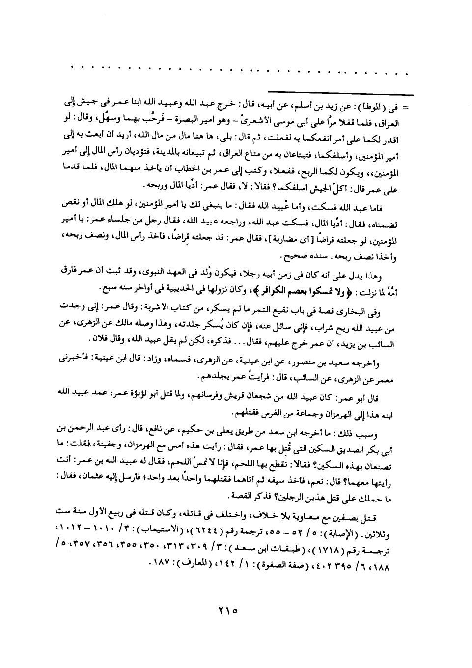 [ () ] في (الموطأ) : عن زيد بن أسلم، عن أبيه، قال: خرج عبد اللَّه وعبيد اللَّه ابنا عمر في جيش إلى العراق، فلما قفلا مرّا على أبى موسى الأشعريّ- وهو أمير البصرة- فرحّب بهما وسهّل، وقال: لو أقدر لكما على أمر أنفعكما به لفعلت، ثم قال: بلى، هاهنا مال من مال اللَّه، أريد أن أبعث به إلى أمير المؤمنين، وأسلفكما، فتبتاعان به من متاع العراق، ثم تبيعانه بالمدينة، فتؤديان رأس المال إلى أمير المؤمنين، ويكون لكما الربح، ففعلا، وكتب إلى عمر بن الخطاب أن يأخذ منهما المال، فلما قدما على عمر قال: أكلّ الجيش أسلفكما؟ فقالا: لا، فقال عمر: أدّيا المال وربحه.