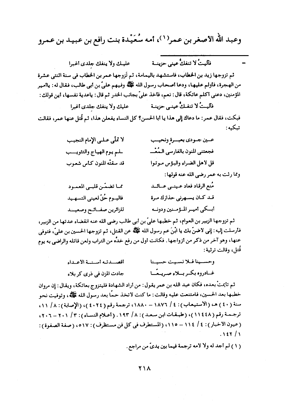 ثم تأيمت بعده، فكان عبد اللَّه بن عمر يقول: من أراد الشهادة فليتزوج بعاتكة، ويقال: إن مروان خطبها بعد الحسين، فامتنعت عليه وقالت: ما كنت لأتخذ حما بعد رسول اللَّه صلّى اللَّه عليه وسلم، وتوفيت نحو سنة (40) هـ، (الاستيعاب) : 4/ 1876- 1880، ترجمة رقم (4024) ، (الإصابة) : 8/ 11، ترجمة رقم (11448) ، (طبقات ابن سعد) : 8/ 193. (أعلام النساء) : 3/ 201- 206، (عيون الأخبار) : 4/ 114- 115، (المستطرف في كل فن مستظرف) : 517، (صفة الصفوة) :