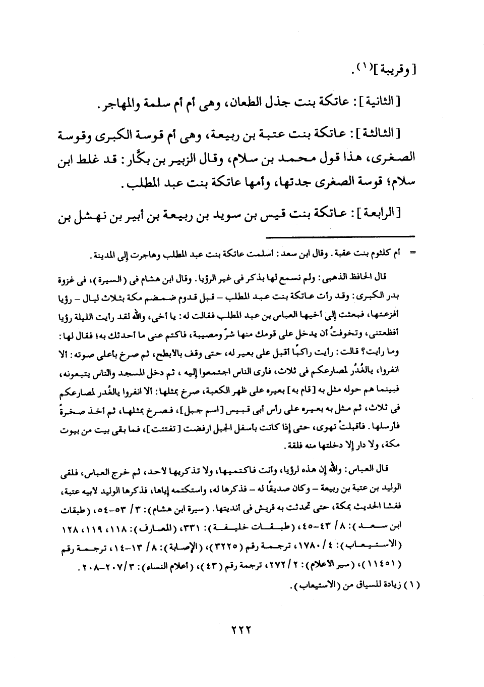 قال الحافظ الذهبي: ولم نسمع لها بذكر في غير الرؤيا. وقال ابن هشام في (السيرة) ، في غزوة بدر الكبرى: وقد رأت عاتكة بنت عبد المطلب- قبل قدوم ضمضم مكة بثلاث ليال- رؤيا أفزعتها، فبعثت إلى أخيها العباس بن عبد المطلب فقالت له: يا أخى، واللَّه لقد رأيت الليلة رؤيا أفظعتنى، وتخوفت أن يدخل على قومك منها شرّ ومصيبة، فأكتم عنى ما أحدثك به، فقال لها: