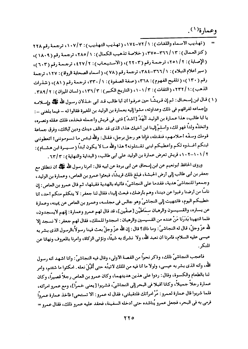 فأعجب النجاشىّ ذلك، وذكر نحوا من القصة الأولى، وقال فيه النجاشىّ: وأنا أشهد أنه رسول اللَّه، وأنه الّذي بشر به عيسى، ولولا ما أنا فيه من الملك لأتيته حتى أقبّل نعله. امكثوا ما شئتم، وأمر لنا بالطعام والكسوة، وقال: ردوا على هذين هديتهما، وكان عمرو بن العاص رجلا قصيرا، وكان عمارة رجلا جميلا، وكانا أقبلا في البحر إلى النجاشىّ، فشربوا [يعنى خمرا] ، ومع عمرو امرأته، فلما شربوا قال عمارة لعمرو: مر امرأتك فلتقبلنى، فقال له عمرو: ألا تستحي! فأخذ عمارة عمروا فرمى به في البحر، فجعل عمرو يناشده حتى أدخله السفينة، فحقد عليه عمرو ذلك، فقال عمرو