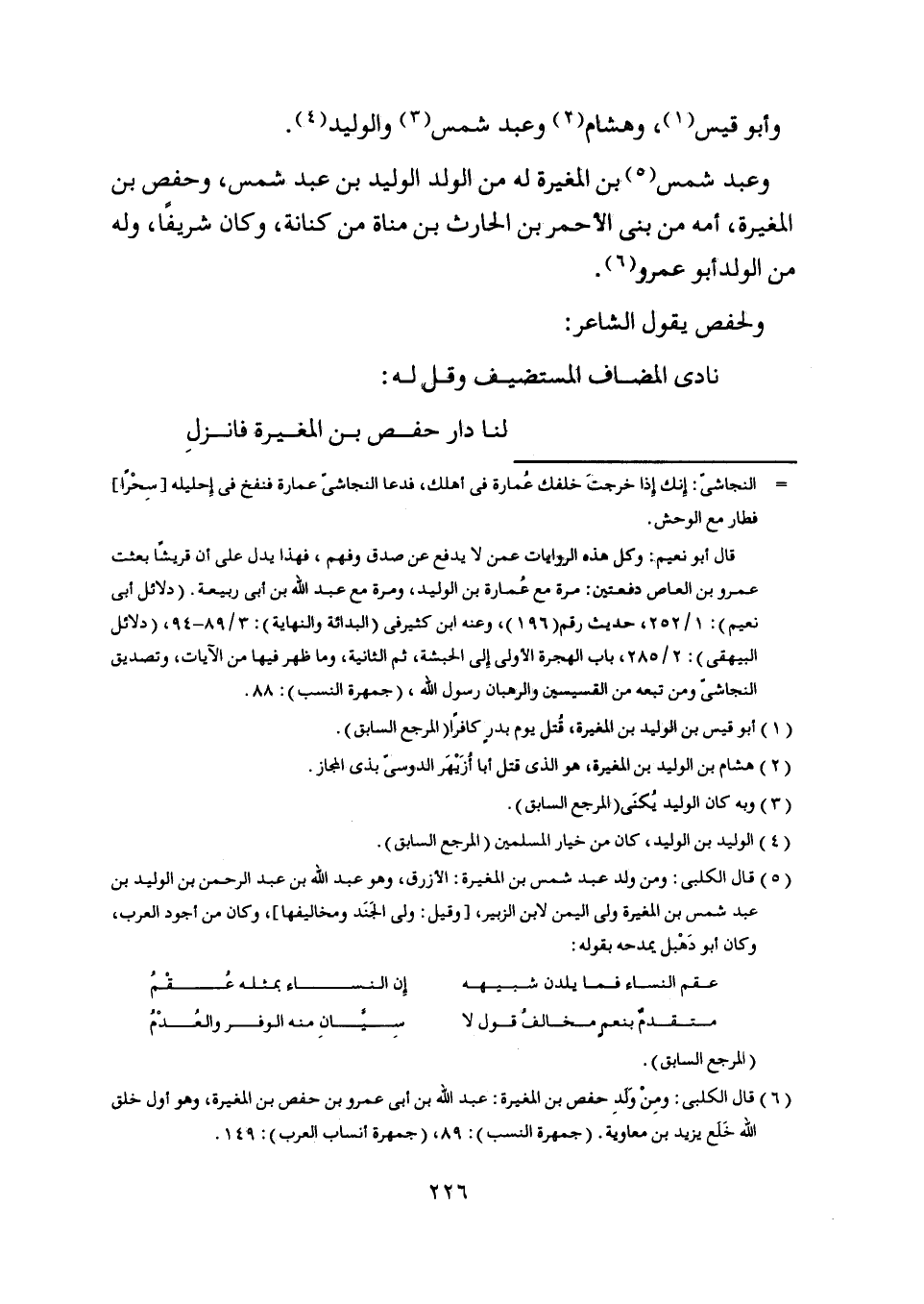 [ (6) ] قال الكلبي: ومن ولد حفص بن المغيرة: عبد اللَّه بن أبى عمرو بن حفص بن المغيرة، وهو أول خلق اللَّه خلع يزيد بن معاوية. (جمهرة النسب) : 89، (جمهرة أنساب العرب) : 149.