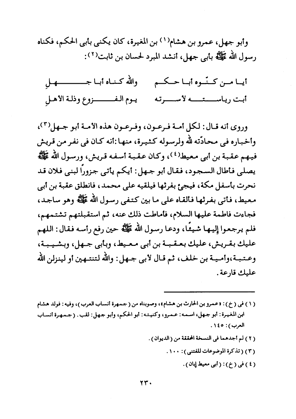 وأبو جهل، عمرو بن هشام [ (1) ] بن المغيرة، كان يكنى بأبي الحكم، فكناه رسول اللَّه صلّى اللَّه عليه وسلم بأبي جهل، أنشد المبرد لحسان بن ثابت [ (2) ] :