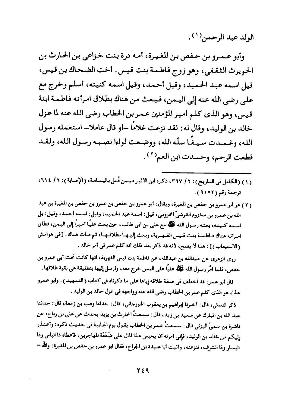 [ (2) ] هو أبو عمرو بن حفص بن المغيرة، ويقال: أبو عمرو بن حفص بن عمرو بن حفص بن المغيرة بن عبد اللَّه بن عمرو بن مخزوم القرشيّ المخزومي، قيل: اسمه عبد الحميد، وقيل: اسمه أحمد، وقيل: بل اسمه كنيته، بعثه رسول اللَّه صلّى اللَّه عليه وسلم مع على بن أبى طالب، حين بعث عليا أميرا إلى اليمن، فطلق امرأته هناك فاطمة بنت قيس الفهرية، وبعث إليها بطلاقها، ثم مات هناك. [في هوامش (الاستيعاب) ] : هذا لا يصح، لأنه قد ذكر بعد ذلك أنه كلم عمر في أمر خالد.