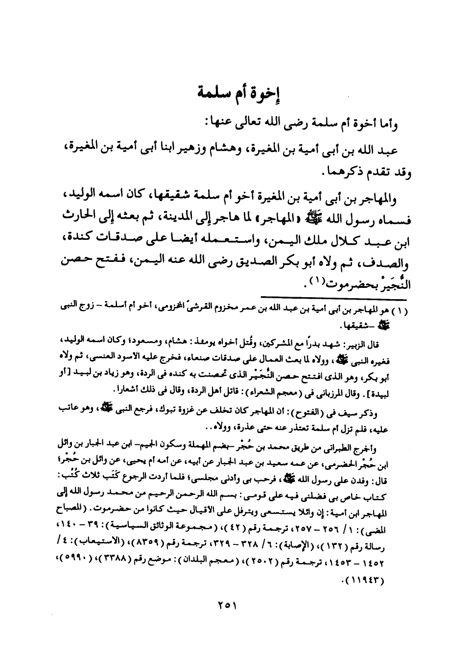 والمهاجر بن أبى أمية بن المغيرة أخو أم سلمة شقيقها، كان اسمه الوليد، فسماه رسول اللَّه صلّى اللَّه عليه وسلم «المهاجر» لما هاجر إلى المدينة، ثم بعثه إلى الحارث ابن عبد كلال ملك اليمن، واستعمله أيضا على صدقات كندة، والصدف، ثم ولاه أبو بكر الصديق رضى اللَّه عنه اليمن، ففتح حصن النّجير بحضر موت [ (1) ] .