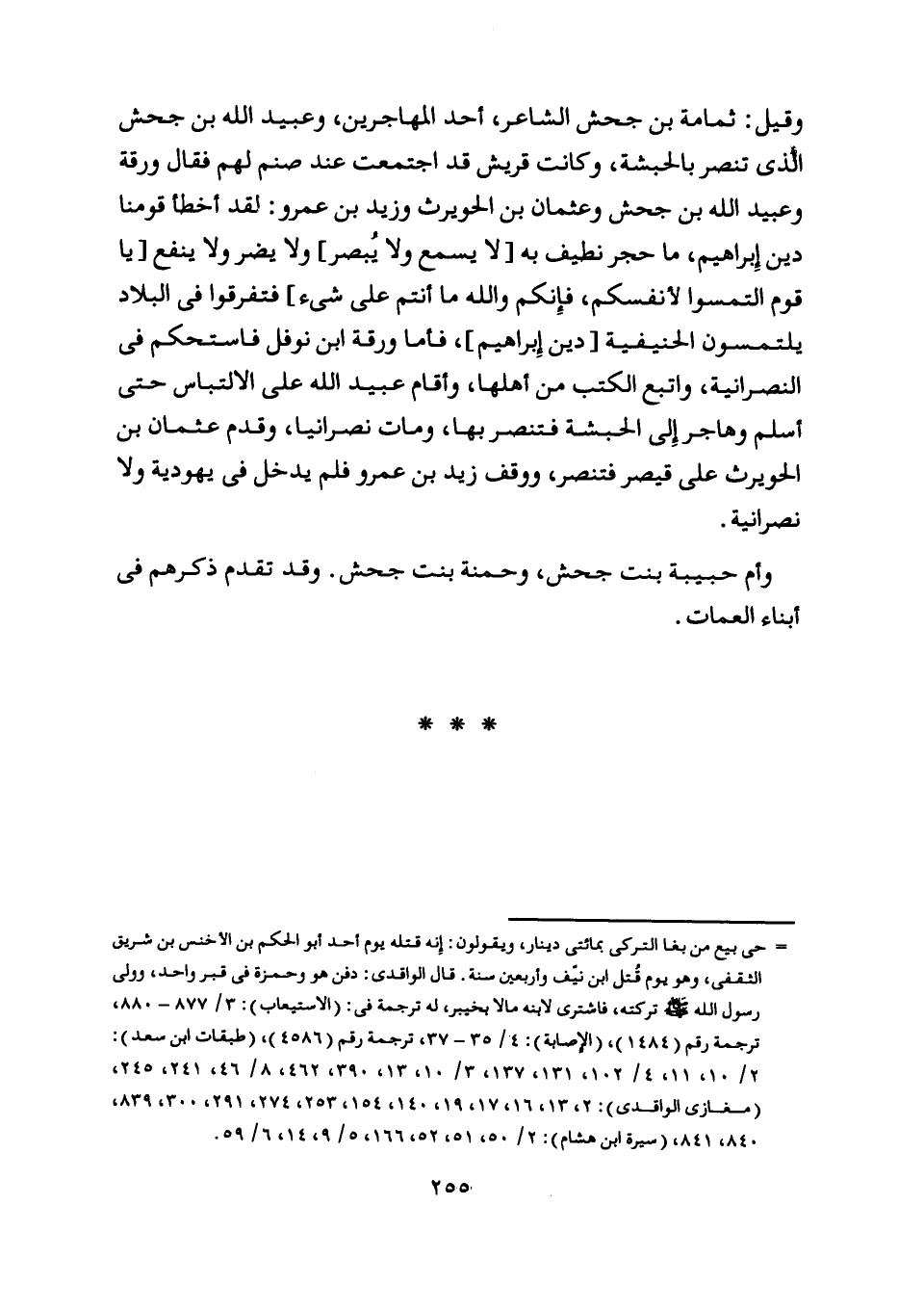 وقيل: ثمامة بن جحش الشاعر، أحد المهاجرين، وعبيد اللَّه بن جحش الّذي تنصر بالحبشة، وكانت قريش قد اجتمعت عند صنم لهم فقال ورقة وعبيد اللَّه بن جحش وعثمان بن الحويرث وزيد بن عمرو: لقد أخطأ قومنا دين إبراهيم، ما حجر نطيف به [لا يسمع ولا يبصر] ولا يضر ولا ينفع [يا قوم التمسوا لأنفسكم، فإنكم واللَّه ما أنتم على شيء] فتفرقوا في البلاد يلتمسون الحنيفية [دين إبراهيم] ، فأما ورقة ابن نوفل فاستحكم في النصرانية، واتبع الكتب من أهلها، وأقام عبيد اللَّه على الالتباس حتى أسلم وهاجر إلى الحبشة فتنصر بها، ومات نصرانيا، وقدم عثمان بن الحويرث على قيصر فتنصر، ووقف زيد بن عمرو فلم يدخل في يهودية ولا نصرانية.
