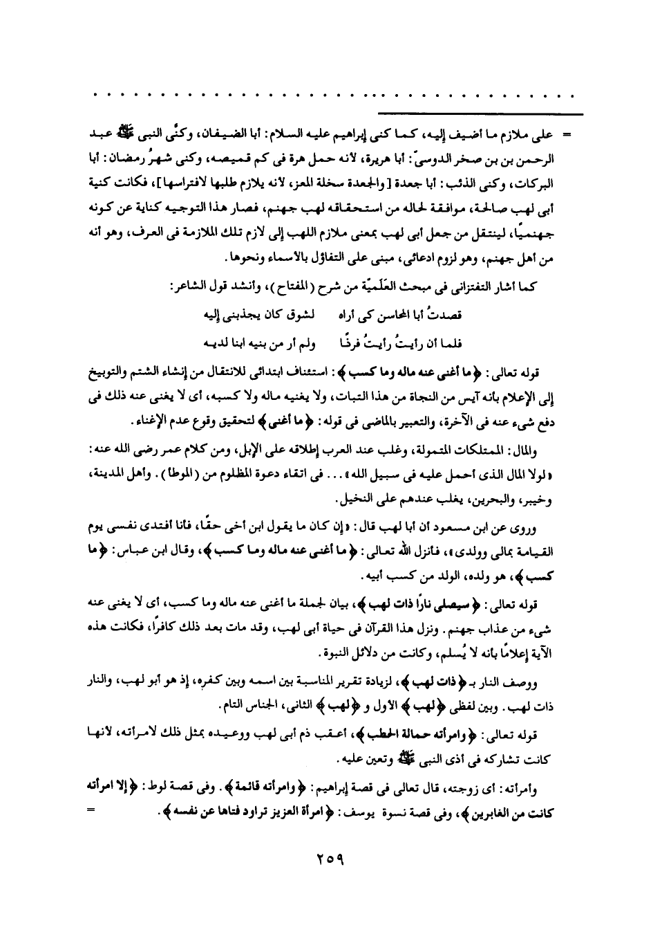 [ () ] على ملازم ما أضيف إليه، كما كنى إبراهيم عليه السّلام: أبا الضيفان، وكنّى النبي صلّى اللَّه عليه وسلم عبد الرحمن بن بن صخر الدوسيّ: أبا هريرة، لأنه حمل هرة في كم قميصه، وكنى شهر رمضان: أبا البركات، وكنى الذئب: أبا جعدة [والجعدة سخلة المعز، لأنه يلازم طلبها لافتراسها] ، فكانت كنية أبى لهب صالحة، موافقة لحاله من استحقاقه لهب جهنم، فصار هذا التوجيه كناية عن كونه جهنميا، لينتقل من جعل أبى لهب بمعنى ملازم اللهب إلى لازم تلك الملازمة في العرف، وهو أنه من أهل جهنم، وهو لزوم ادعائى، مبنى على التفاؤل بالأسماء ونحوها.