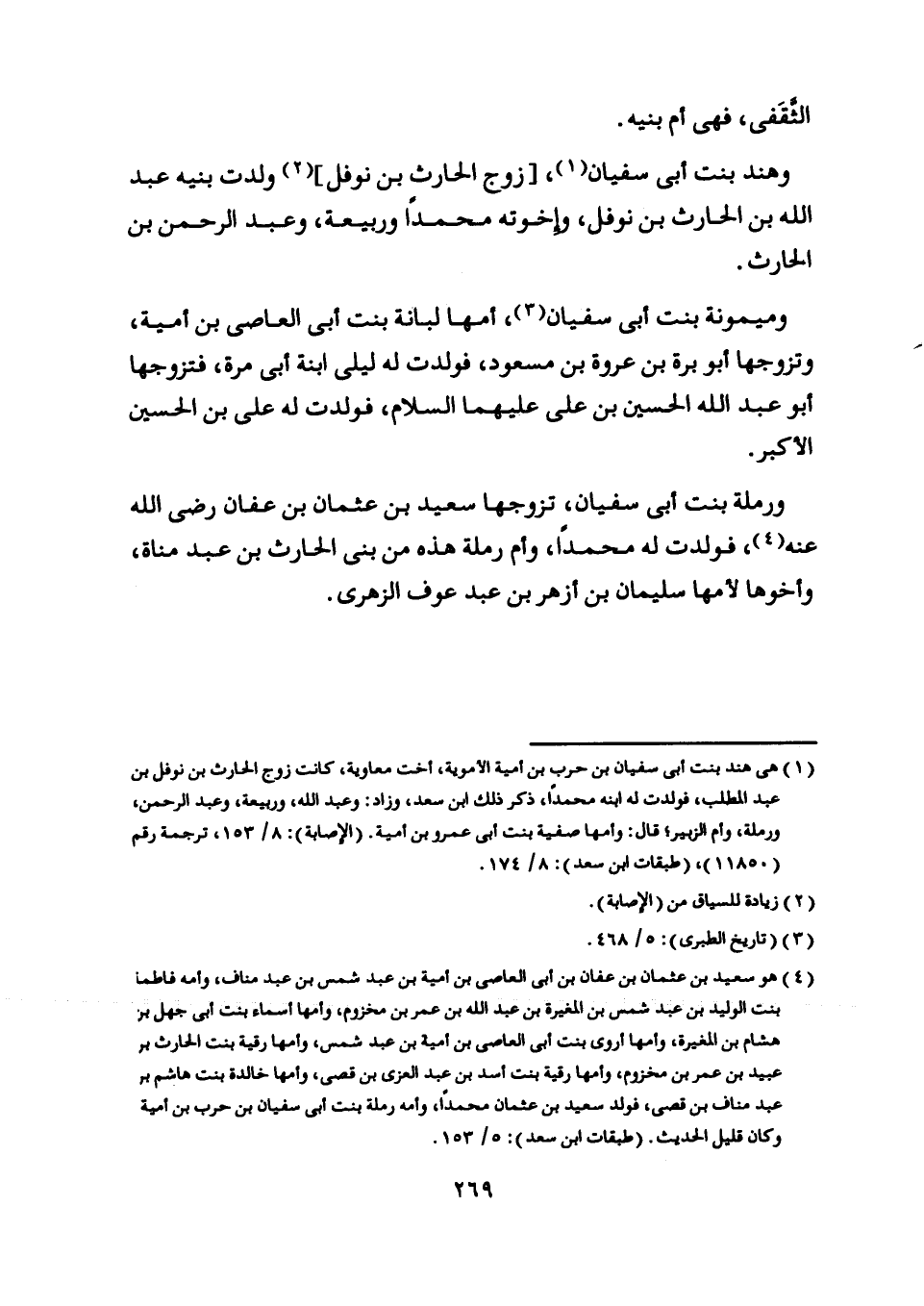 [ (1) ] هي هند بنت أبى سفيان بن حرب بن أمية الأموية، أخت معاوية، كانت زوج الحارث بن نوفل بن عبد المطلب، فولدت له ابنه محمدا، ذكر ذلك ابن سعد، وزاد: وعبد اللَّه، وربيعة، وعبد الرحمن، ورملة، وأم الزبير، قال: وأمها صفية بنت أبى عمرو بن أمية. (الإصابة) : 8/ 153، ترجمة رقم (11850) ، (طبقات ابن سعد) : 8/ 174.