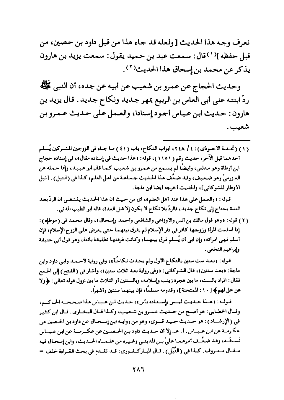 [ (1) ] (تحفة الأحوذي) : 4/ 248، أبواب النكاح، باب (41) ما جاء في الزوجين المشركين يسلم أحدهما قبل الآخر، حديث رقم (1151) ، قوله: «هذا حديث في إسناده مقال» ، في إسناده حجاج ابن أرطاة وهو مدلس، وأيضا لم يسمع من عمرو بن شعيب كما قال أبو عبيد، وإنما حمله عن العزرمىّ وهو ضعيف، وقد ضعّف هذا الحديث جماعة من أهل العلم، كذا في (النيل) . [نيل الأوطار للشوكانى] ، والحديث أخرجه أيضا ابن ماجة.