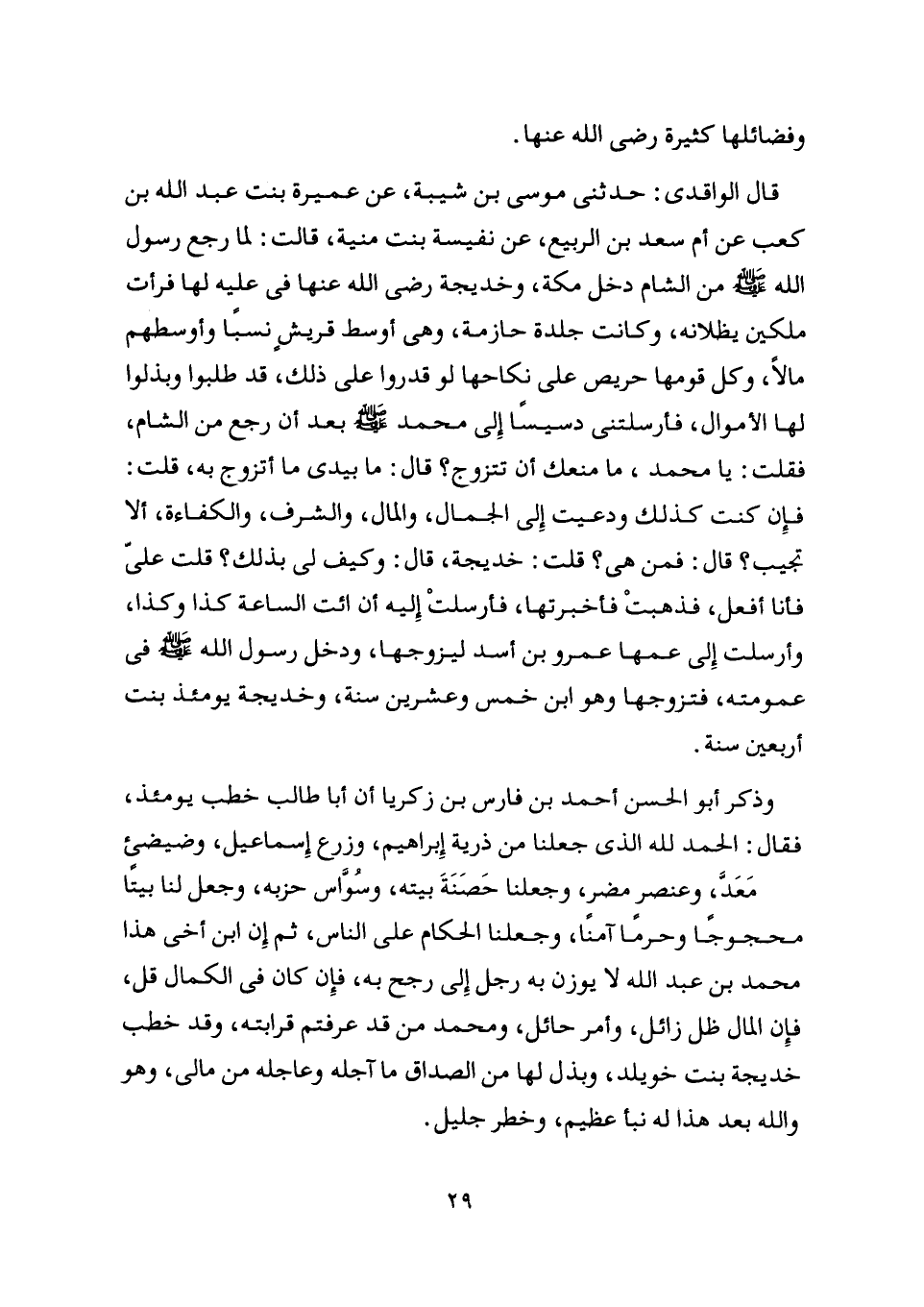 وذكر أبو الحسن أحمد بن فارس بن زكريا أن أبا طالب خطب يومئذ، فقال: الحمد للَّه الّذي جعلنا من ذرية إبراهيم، وزرع إسماعيل، وضئضيء معدّ، وعنصر مضر، وجعلنا حصنة بيته، وسوّاس حزبه، وجعل لنا بيتا محجوجا وحرما آمنا، وجعلنا الحكام على الناس، ثم إن ابن أخى هذا محمد بن عبد اللَّه لا يوزن به رجل إلى رجح به، فإن كان في الكمال قل، فإن المال ظل زائل، وأمر حائل، ومحمد من قد عرفتم قرابته، وقد خطب خديجة بنت خويلد، وبذل لها من الصداق ما آجله وعاجله من مالي، وهو واللَّه بعد هذا له نبأ عظيم، وخطر جليل.