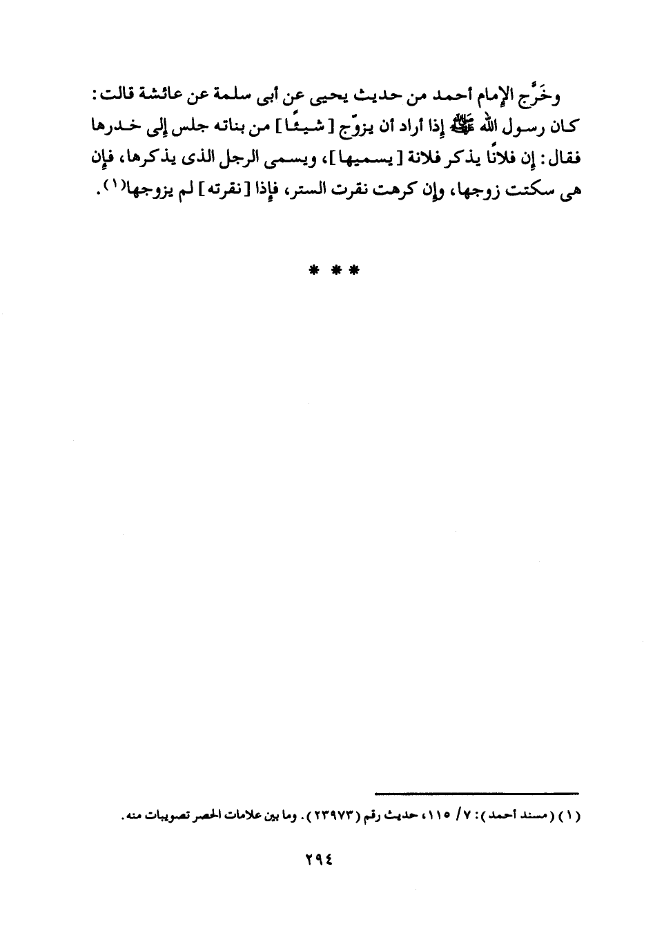 وخرّج الإمام أحمد من حديث يحيى عن أبى سلمة عن عائشة قالت: كان رسول اللَّه صلّى اللَّه عليه وسلم إذا أراد أن يزوّج [شيئا] من بناته جلس إلى خدرها فقال: إن فلانا يذكر فلانة [يسميها] ، ويسمى الرجل الّذي يذكرها، فإن هي سكتت زوجها، وإن كرهت نقرت الستر، فإذا [نقرته] لم يزوجها [ (1) ] .