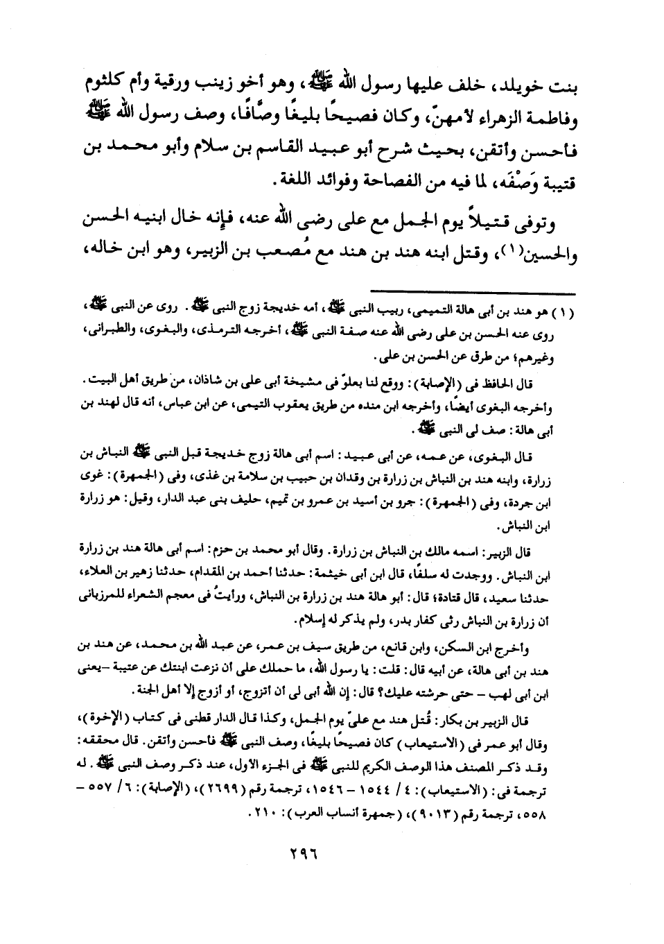 بنت خويلد، خلف عليها رسول اللَّه صلّى اللَّه عليه وسلم، وهو أخو زينب ورقية وأم كلثوم وفاطمة الزهراء لأمهنّ، وكان فصيحا بليغا وصّافا، وصف رسول اللَّه صلّى اللَّه عليه وسلم فأحسن وأتقن، بحيث شرح أبو عبيد القاسم بن سلام وأبو محمد بن قتيبة وصفه، لما فيه من الفصاحة وفوائد اللغة.