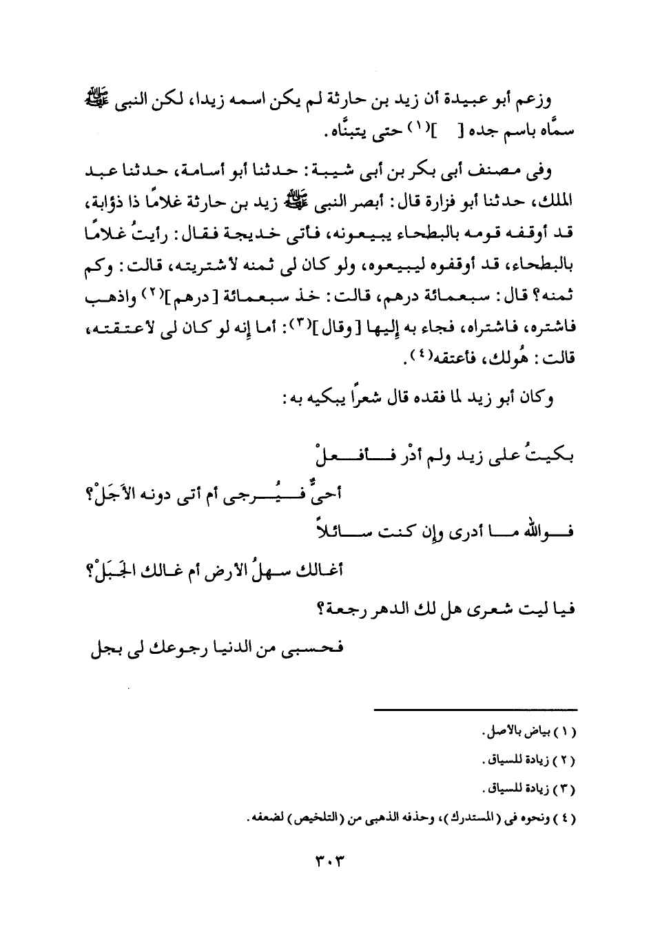 وزعم أبو عبيدة أن زيد بن حارثة لم يكن اسمه زيدا، لكن النبي صلّى اللَّه عليه وسلم سمّاه باسم جده [] [ (1) ] حتى يتبنّاه.