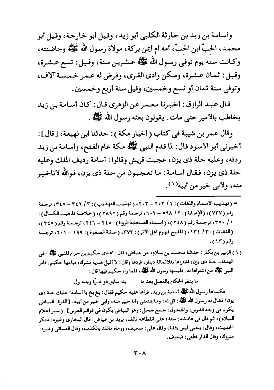 وأسامة بن زيد بن حارثة الكلبي أبو زيد، وقيل أبو خارجة، وقيل أبو محمد، الحبّ ابن الحبّ، أمه أم أيمن بركة، مولاة رسول اللَّه صلّى اللَّه عليه وسلم وحاضنته، وكانت سنة يوم توفى رسول اللَّه صلّى اللَّه عليه وسلم عشرين سنة، وقيل: تسع عشرة، وقيل: ثمان عشرة، وسكن وادي القرى، وفرض له عمر خمسة آلاف، وتوفى سنة ثمان أو تسع وخمسين، وقيل سنة أربع وخمسين.