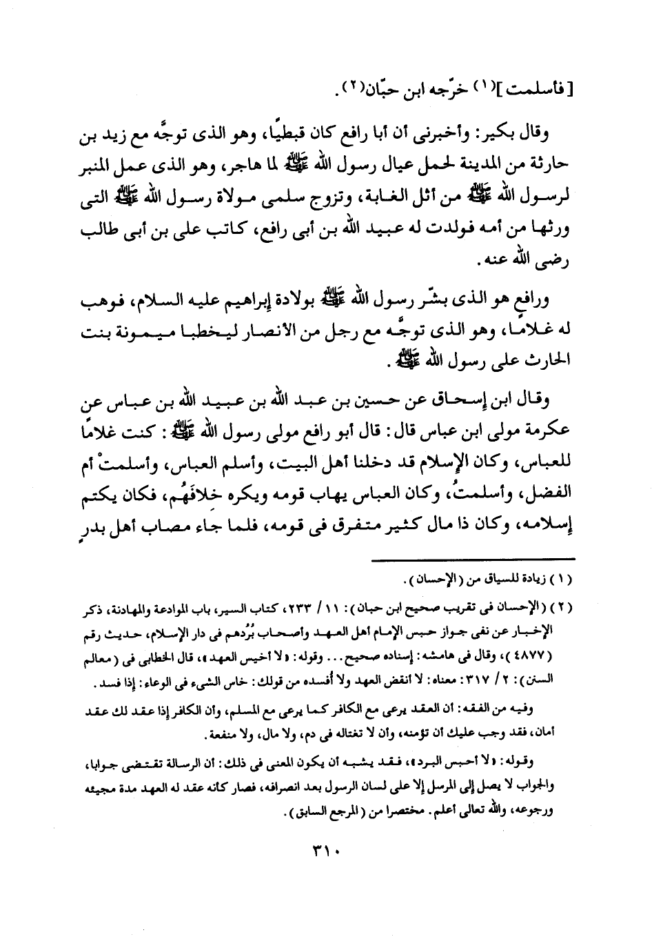 وقال ابن إسحاق عن حسين بن عبد اللَّه بن عبيد اللَّه بن عباس عن عكرمة مولى ابن عباس قال: قال أبو رافع مولى رسول اللَّه صلّى اللَّه عليه وسلم: كنت غلاما للعباس، وكان الإسلام قد دخلنا أهل البيت، وأسلم العباس، وأسلمت أم الفضل، وأسلمت، وكان العباس يهاب قومه ويكره خلافهم، فكان يكتم إسلامه، وكان ذا مال كثير متفرق في قومه، فلما جاء مصاب أهل بدر