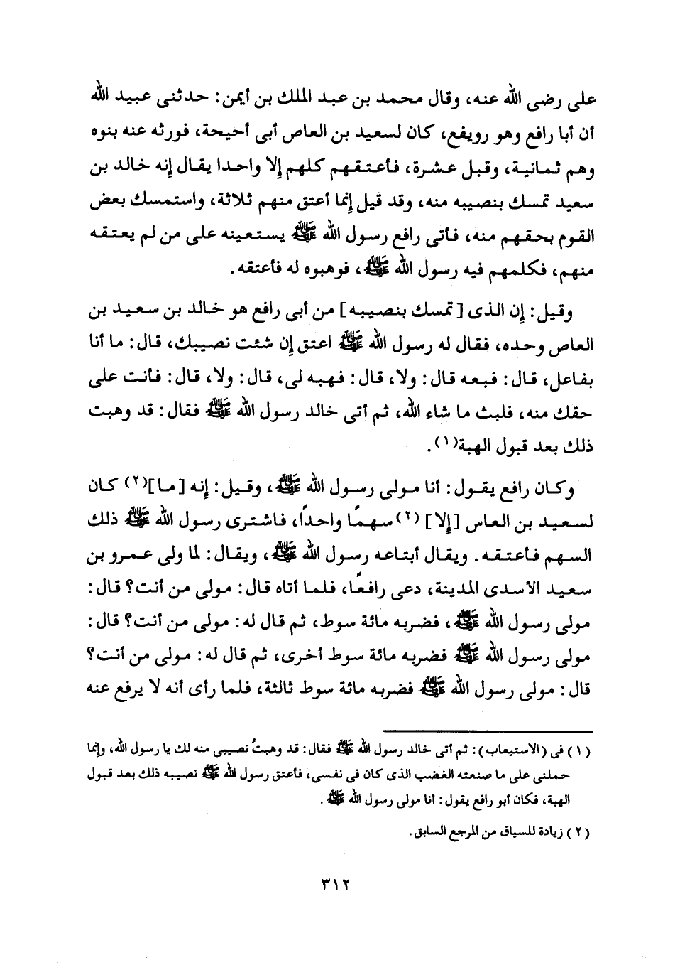 [ (1) ] في (الاستيعاب) : ثم أتى خالد رسول اللَّه صلّى اللَّه عليه وسلم فقال: قد وهبت نصيبي منه لك يا رسول اللَّه، وإنما حملني على ما صنعته الغضب الّذي كان في نفسي، فأعتق رسول اللَّه صلّى اللَّه عليه وسلم نصيبه ذلك بعد بعد قبول الهبة، فكان أبو رافع يقول: أنا مولى رسول اللَّه صلّى اللَّه عليه وسلم.