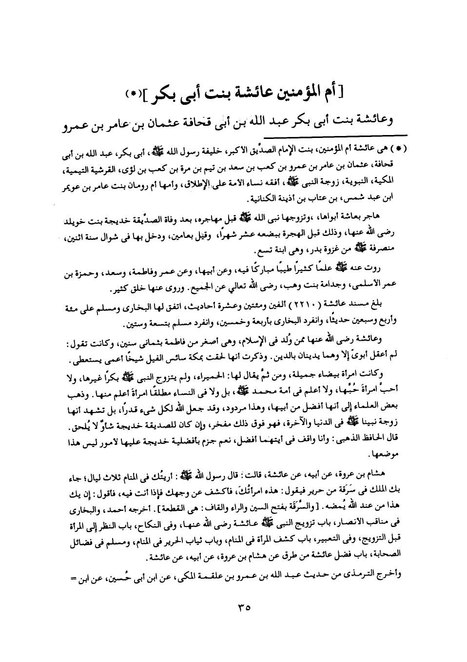 [ (1) ] هي عائشة أم المؤمنين، بنت الإمام الصدّيق الأكبر، خليفة رسول اللَّه صلّى اللَّه عليه وسلم، أبى بكر، عبد اللَّه بن أبى قحافة، عثمان بن عامر بن عمرو بن كعب بن سعد بن تيم بن مرة بن كعب بن لؤيّ، القرشية التيمية، المكية، النبويّة، زوجة النبي صلّى اللَّه عليه وسلم، أفقه نساء الأمة على الإطلاق، وأمها أم رومان بنت عامر بن عويمر ابن عبد شمس، بن عتاب بن أذينة الكنانية.