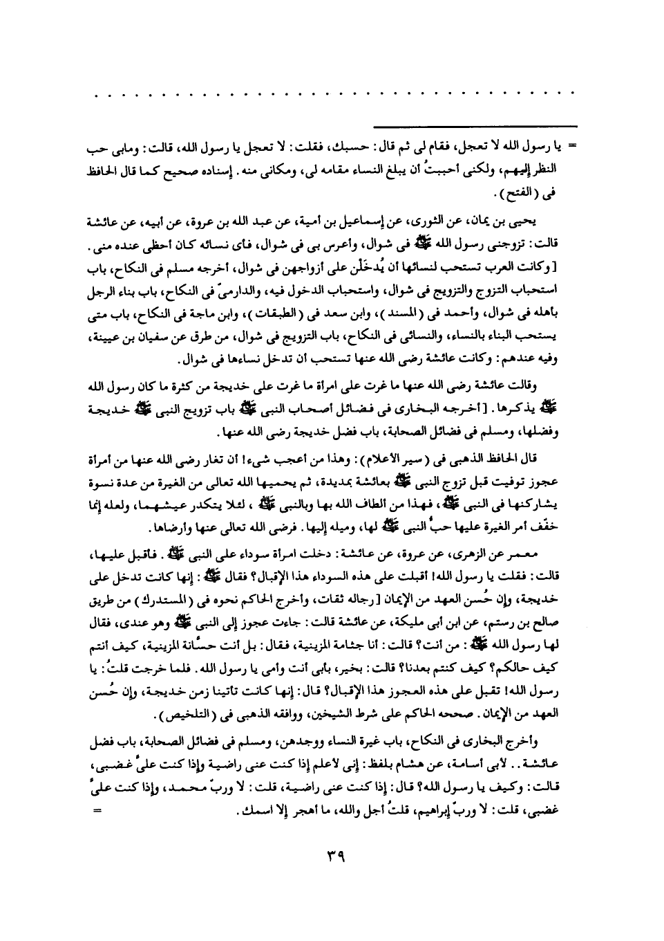 وقالت عائشة رضى اللَّه عنها ما غرت على امرأة ما غرت على خديجة من كثرة ما كان رسول اللَّه صلّى اللَّه عليه وسلم يذكرها. [أخرجه البخاري في فضائل أصحاب النبي صلّى اللَّه عليه وسلم باب تزويج النبي صلّى اللَّه عليه وسلم خديجة وفضلها، ومسلم في فضائل الصحابة، باب فضل خديجة رضى اللَّه عنها.