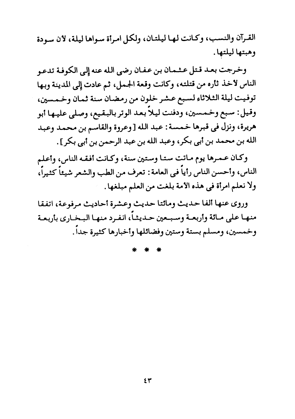 وكان عمرها يوم ماتت ستا وستين سنة، وكانت أفقه الناس، وأعلم الناس، وأحسن الناس رأيا في العامة: تعرف من الطب والشعر شيئا كثيرا، ولا نعلم امرأة في هذه الأمة بلغت من العلم مبلغها.