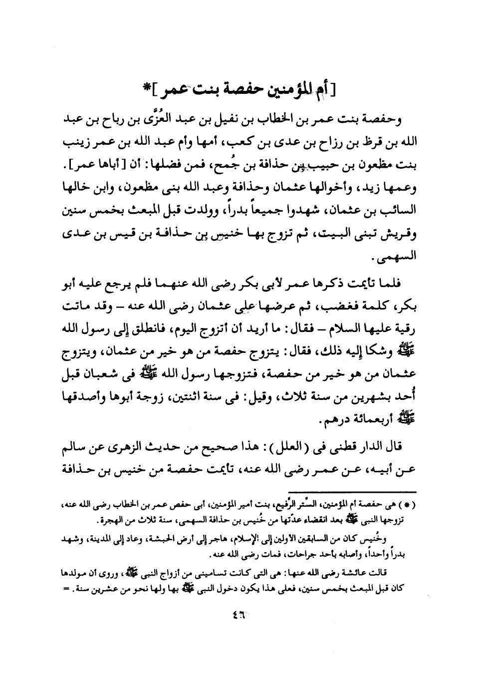 [ (1) ] هي حفصة أم المؤمنين، السّتر الرّفيع، بنت أمير المؤمنين، أبى حفص عمر بن الخطاب رضى اللَّه عنه، تزوجها النبي صلّى اللَّه عليه وسلم بعد انقضاء عدّتها من خنيس بن حذافة السهمي، سنة ثلاث من الهجرة.