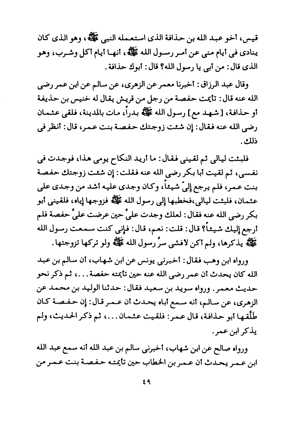 وقال عبد الرزاق: أخبرنا معمر عن الزهري، عن سالم عن ابن عمر رضى اللَّه عنه قال: تأيمت حفصة من رجل من قريش يقال له خنيس بن حذيفة أو حذافة، [شهد مع] رسول اللَّه صلّى اللَّه عليه وسلم بدرا، مات بالمدينة، فلقى عثمان رضى اللَّه عنه فقال: إن شئت زوجتك حفصة بنت عمر، قال: انظر في ذلك.