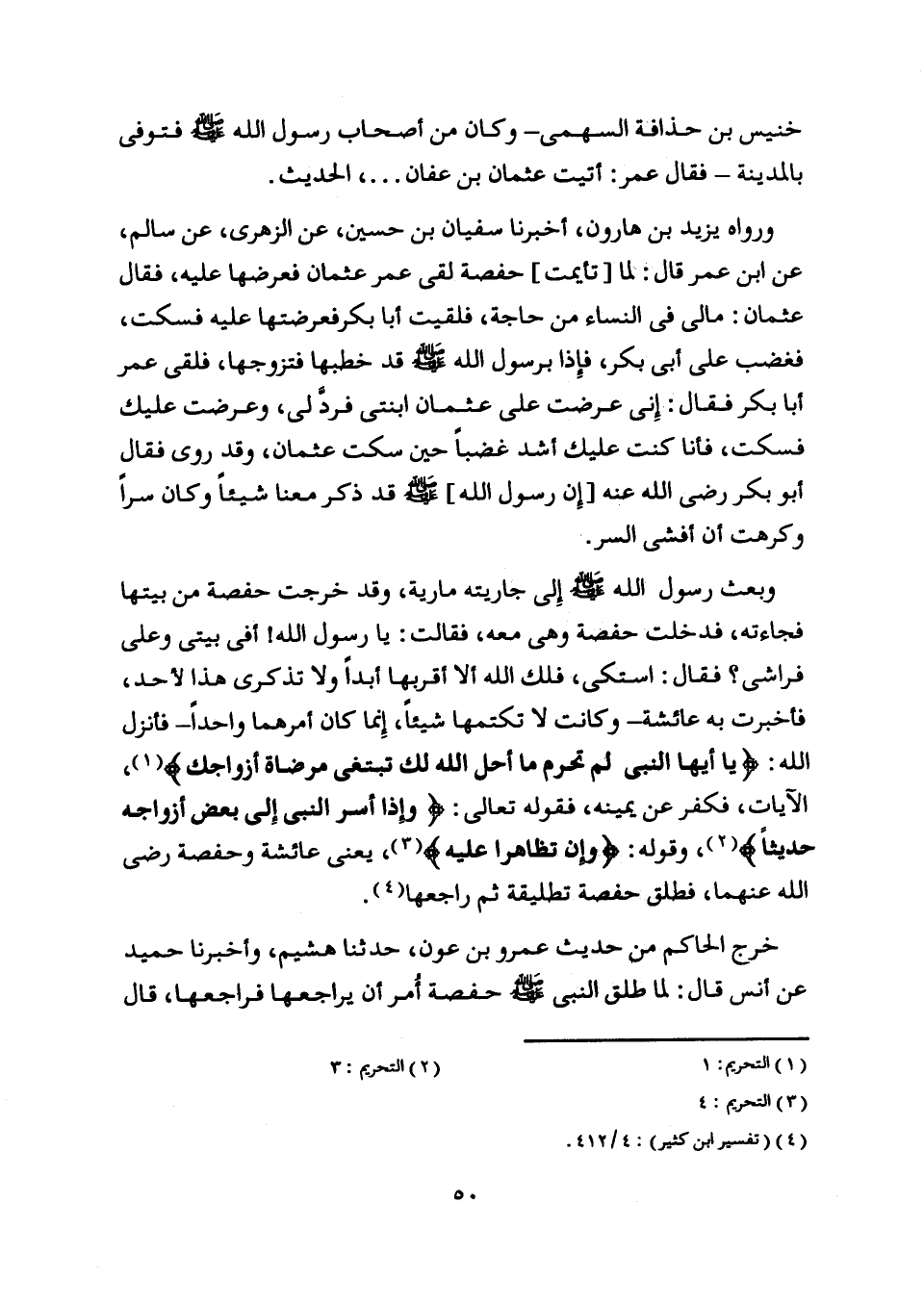 - فأنزل اللَّه: يا أَيُّهَا النَّبِيُّ لِمَ تُحَرِّمُ ما أَحَلَّ اللَّهُ لَكَ تَبْتَغِي مَرْضاتَ أَزْواجِكَ [ (1) ] ، الآيات، فكفر عن يمينه، فقوله تعالى: وَإِذْ أَسَرَّ النَّبِيُّ إِلى بَعْضِ أَزْواجِهِ حَدِيثاً [ (2) ] ، وقوله: وَإِنْ تَظاهَرا عَلَيْهِ [ (3) ] ، يعنى عائشة وحفصة رضى اللَّه عنهما، فطلق حفصة تطليقة ثم راجعها [ (4) ] .