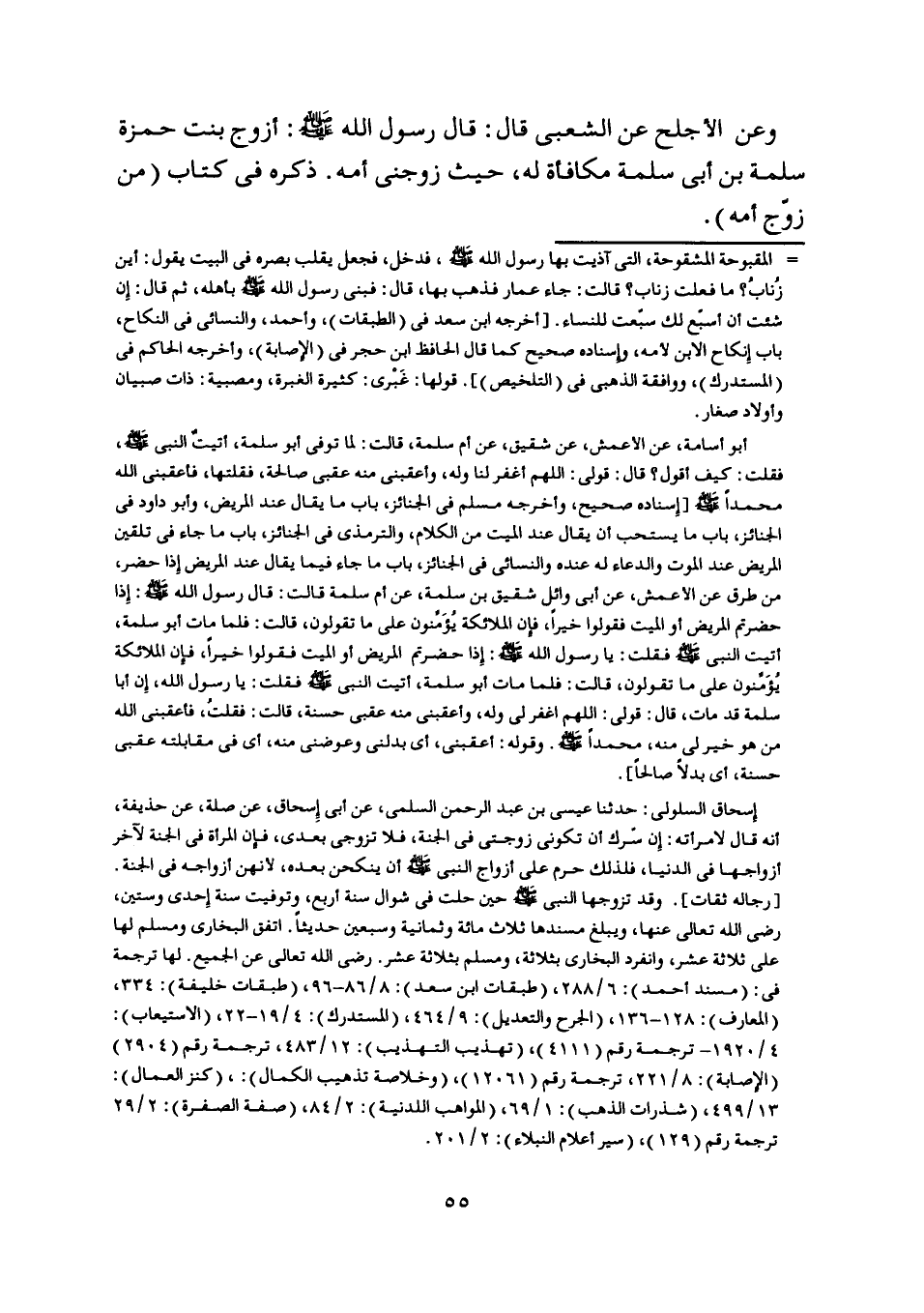 وعن الأجلح عن الشعبي قال: قال رسول اللَّه صلّى اللَّه عليه وسلم، أزوج بنت حمزة سلمة بن أبى سلمة مكافأة له، حيث زوجني أمه. ذكره في كتاب (من زوّج أمه) .