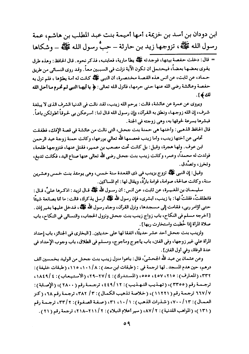 وعن عثمان بن عبد اللَّه الجحشى، قال: باعوا منزل زينب بنت جحش من الوليد بخمسين ألف درهم، حين هدم المسجد. لها ترجمة في: (طبقات ابن سعد) : 8/ 101، 115، (طبقات خليفة) :