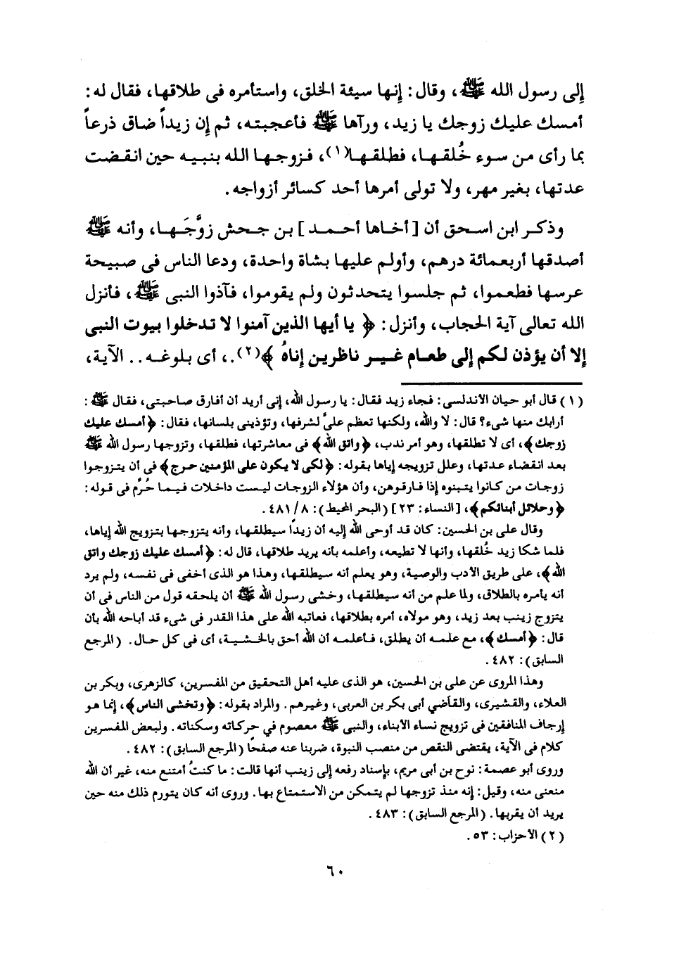 وهذا المروي عن على بن الحسين، هو الّذي عليه أهل التحقيق من المفسرين، كالزهرى، وبكر بن العلاء، والقشيري، والقاضي أبى بكر بن العربيّ، وغيرهم. والمراد بقوله: وَتَخْشَى النَّاسَ، إنما هو إرجاف المنافقين في تزويج نساء الأبناء، والنبي صلّى اللَّه عليه وسلم معصوم في حركاته وسكناته. ولبعض المفسرين كلام في الآية، يقتضي النقص من منصب النبوة، ضربنا عنه صفحا (المرجع السابق) : 482.